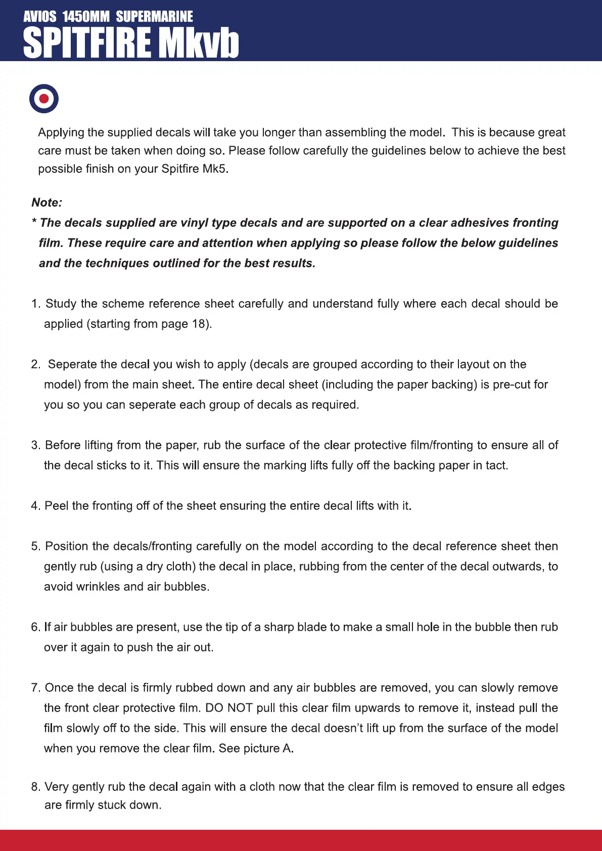 Avios SPITFIRE Mkvb - DECAL APPLICATION GUIDELINES