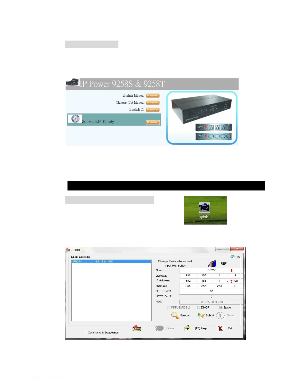 Open “IPEdit.exe”. Make sure that the IP Power 9258