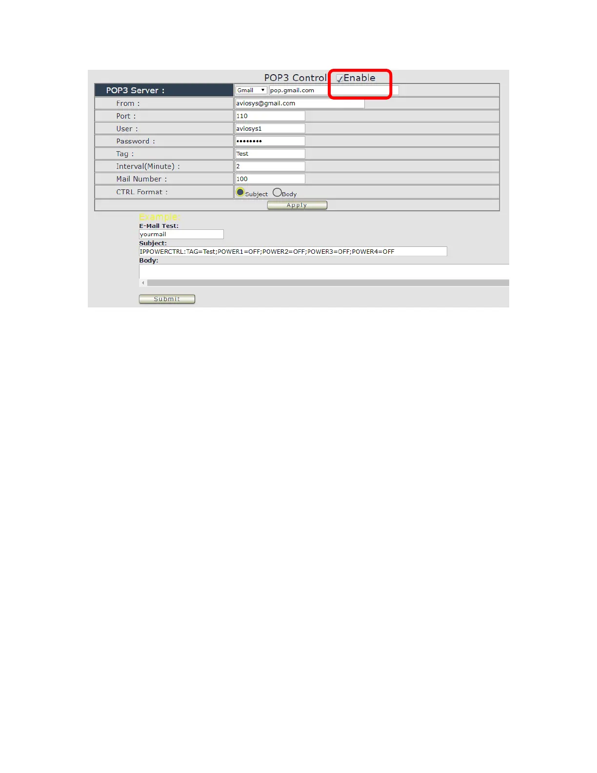 ⚫ User : Username to login the receiver’s e-mail Ex.: aviosys1 or aviosys1@gmail.com