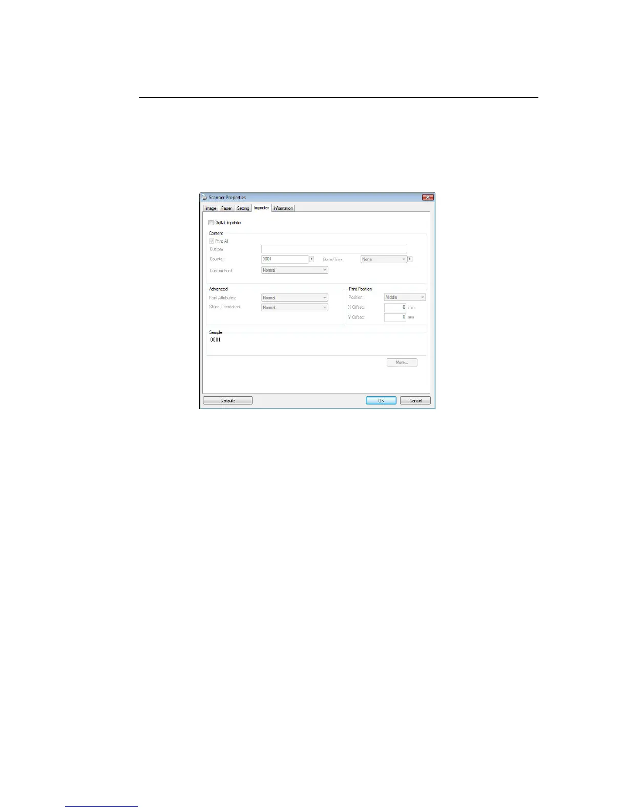 The Imprinter tab allows you to print alphanumeric characters, date, time,