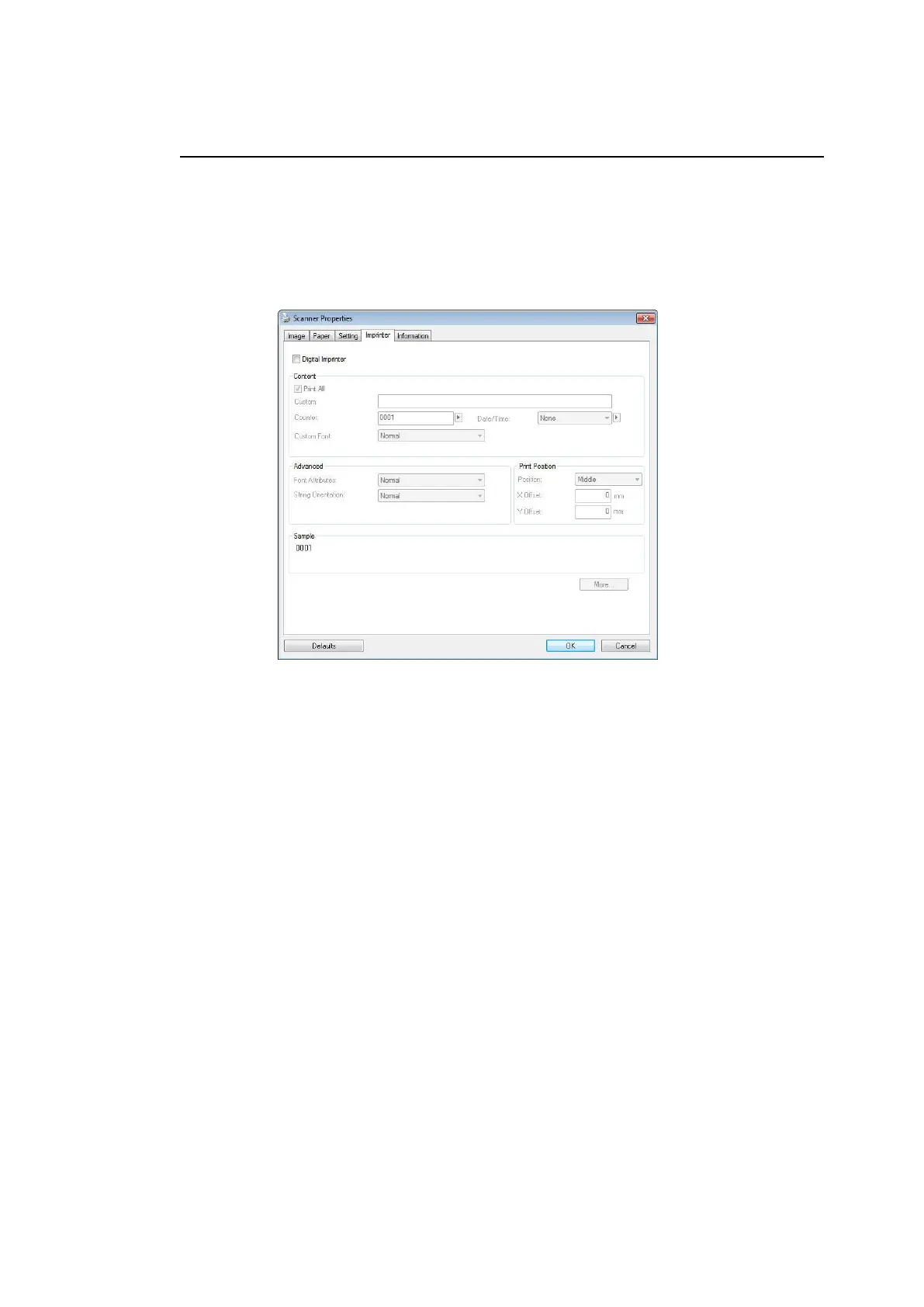 The Imprinter tab allows you to print alphanumeric characters, date, time,