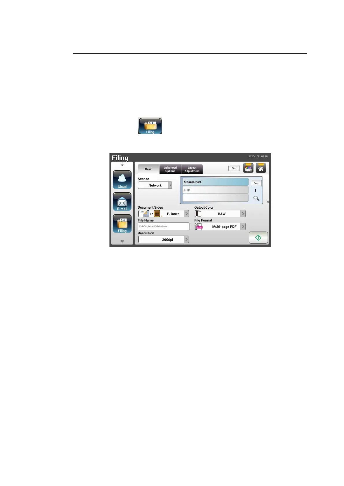 2. Press the Filing button on the Home screen. The LCD Touch Panel