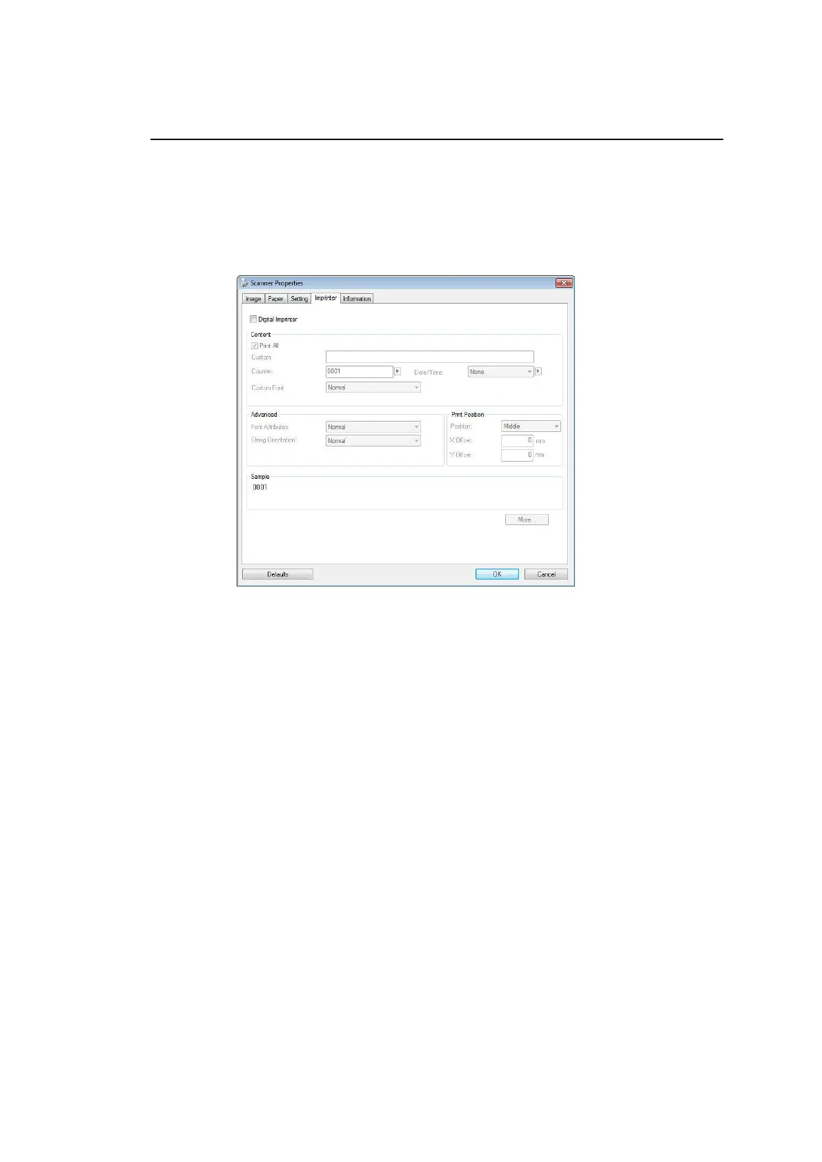 The Imprinter tab allows you to print alphanumeric characters, date, time,