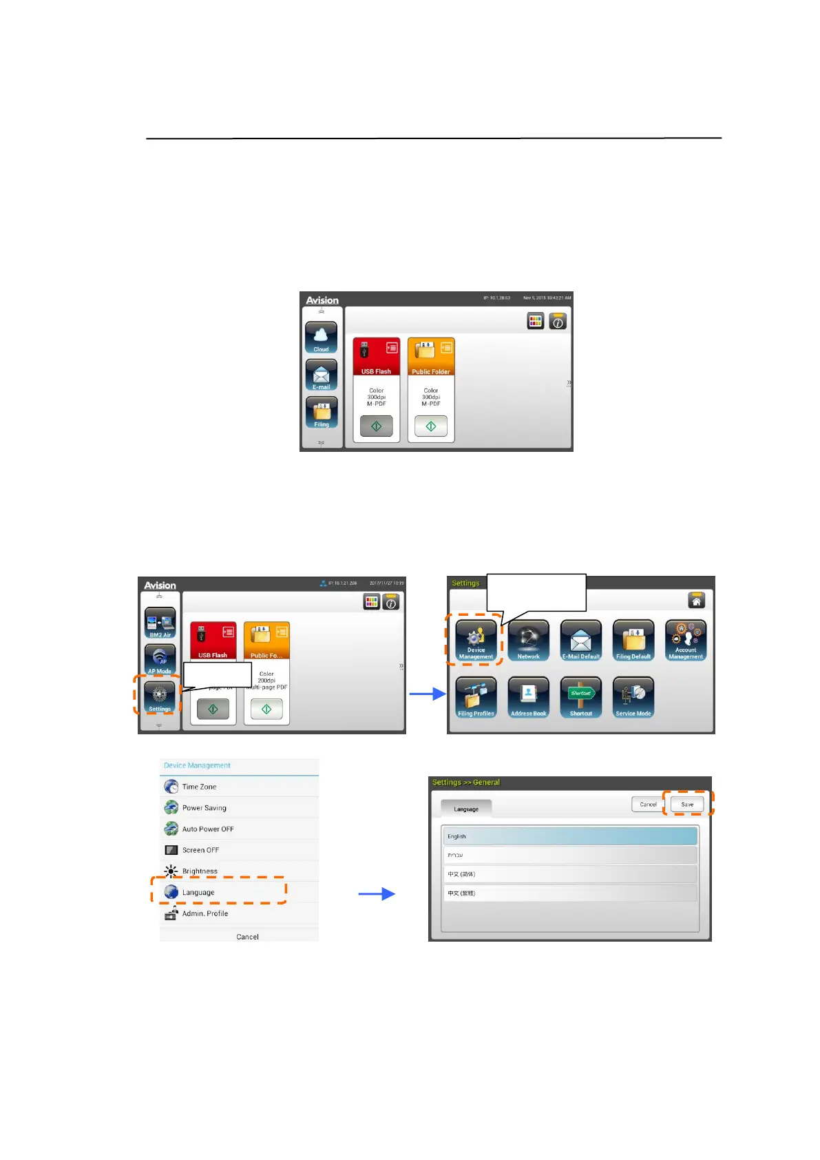 2. On the LCD Touch Panel, tap [Settings]> [Device Management]