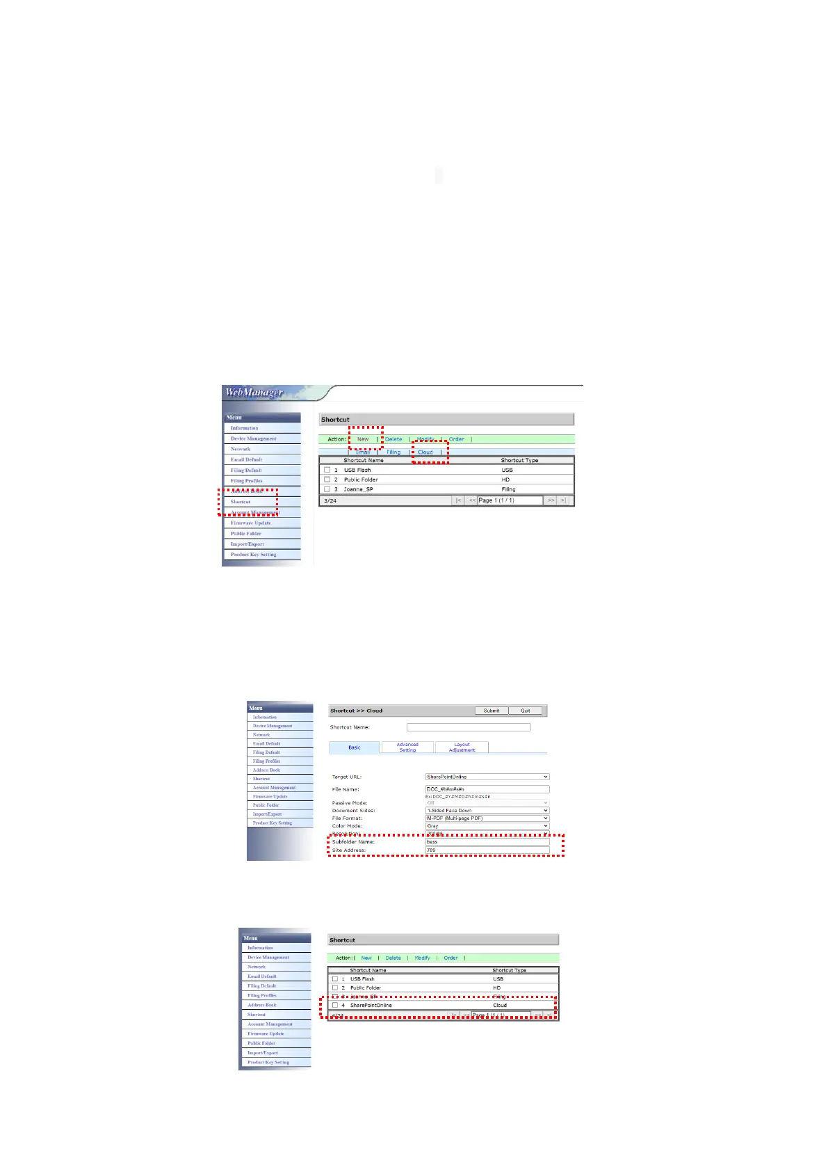 3. Click [ShortCut]>[New]>[Cloud] in succession to create a new ShorCut to