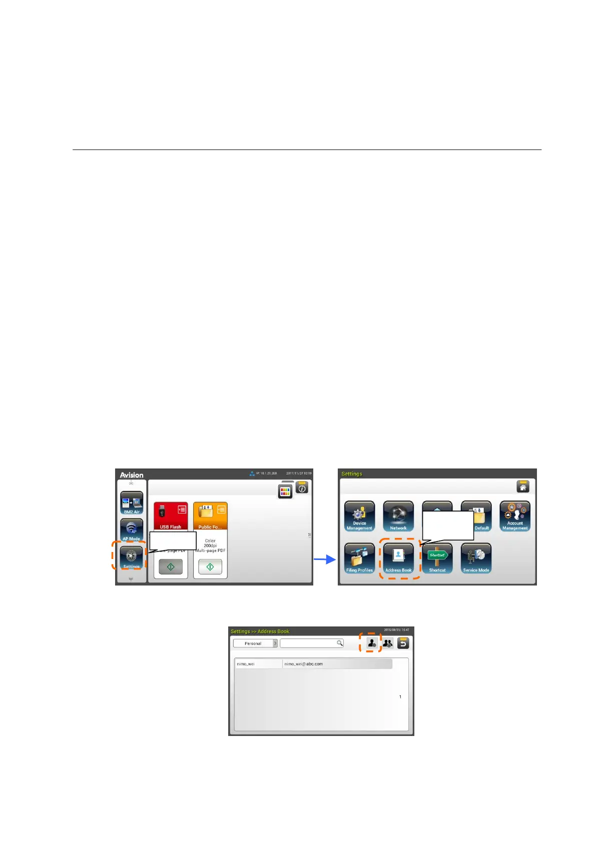 1. On the Home screen of the LCD Touch Panel, select [Settings]>[Address