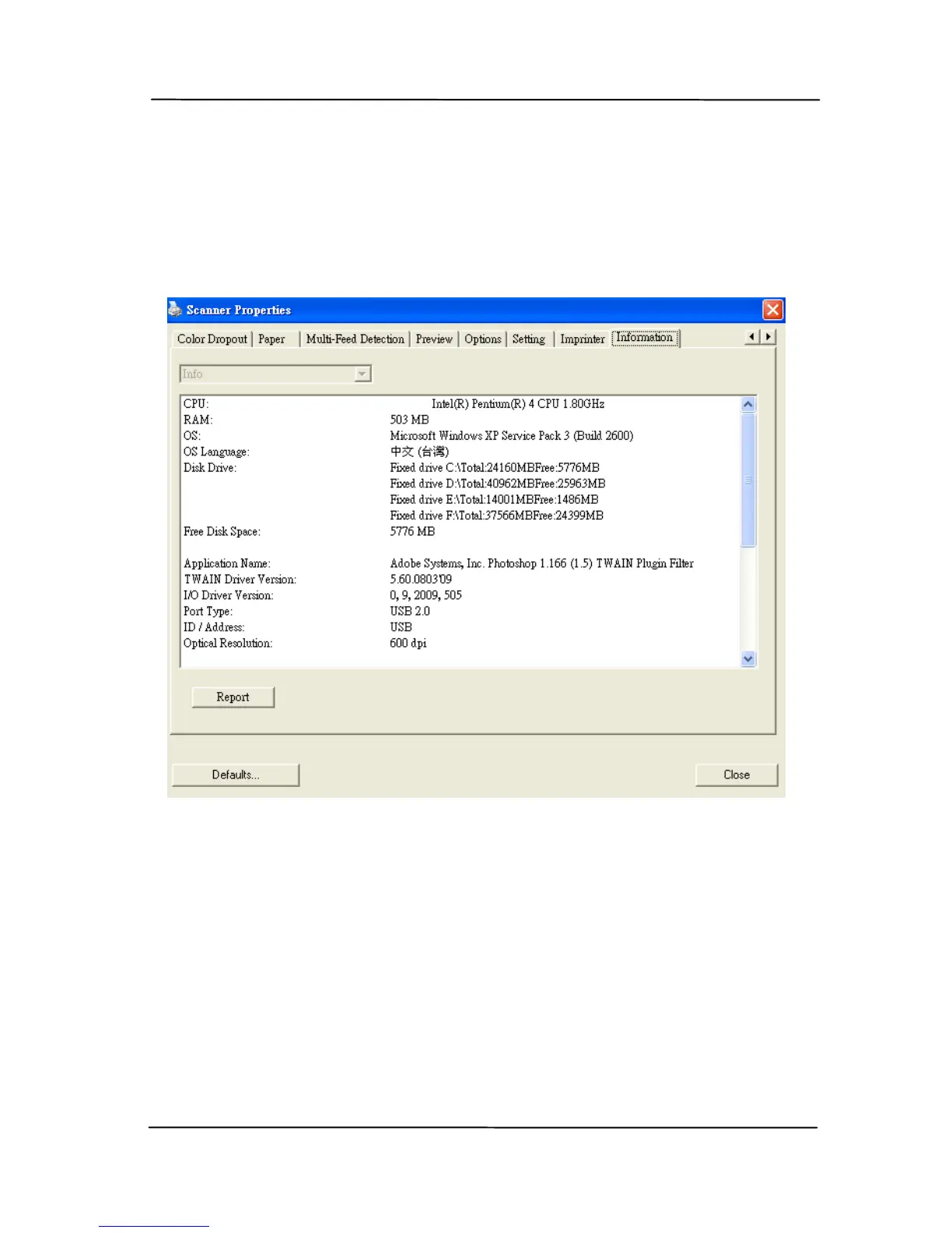 The Information tab displays the following system and scanner