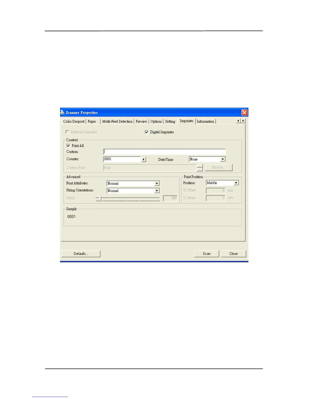 The Imprinter tab allows you to print alphanumeric characters,