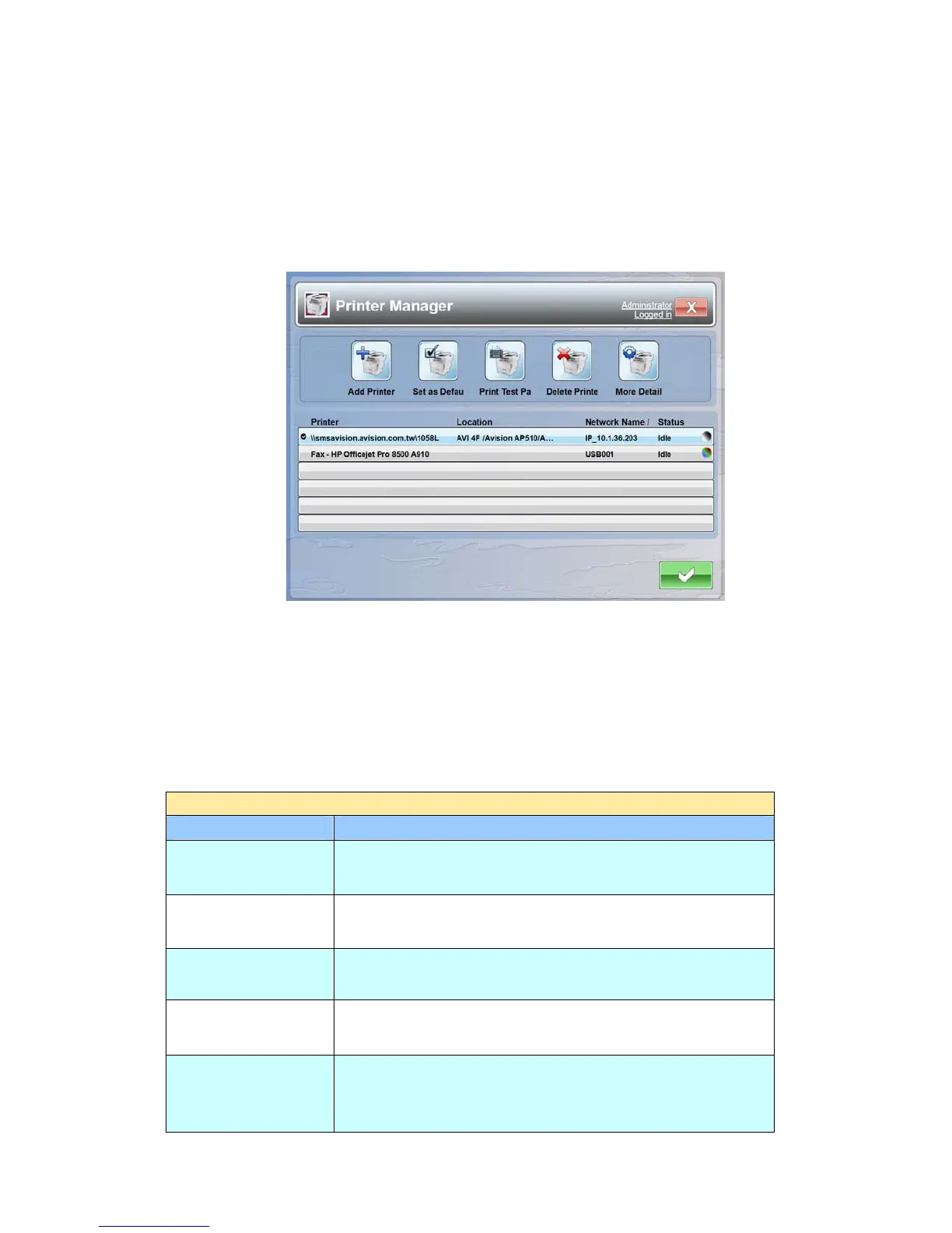 1. Tap the [Output Printer] button to open the following Printer Manager.