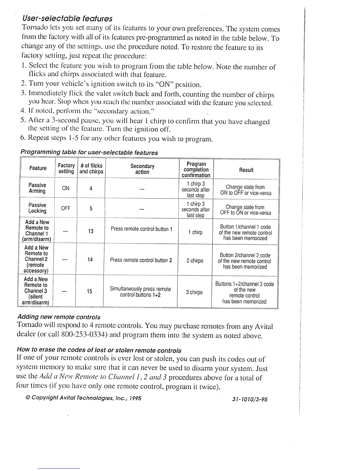 Avital Tornado - User-selectable features; Adding new remote controls; How to erase the codes of lost or stolen remote controls