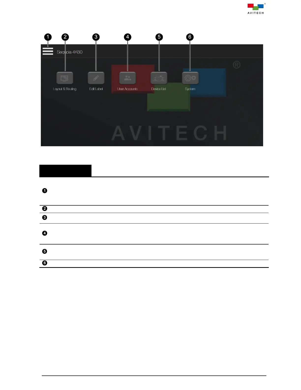 The following table gives an overview of the entire web browser-based GUI’s components and briefly