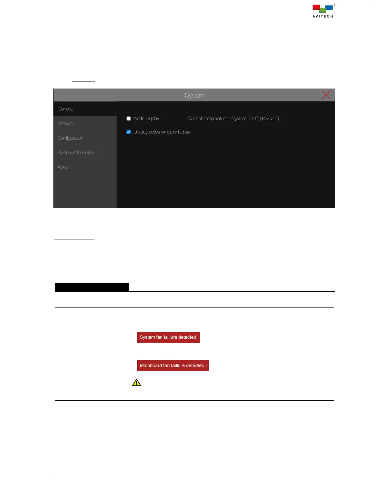A “System fan failure detected!” alert appears on top-left portion of monitor.