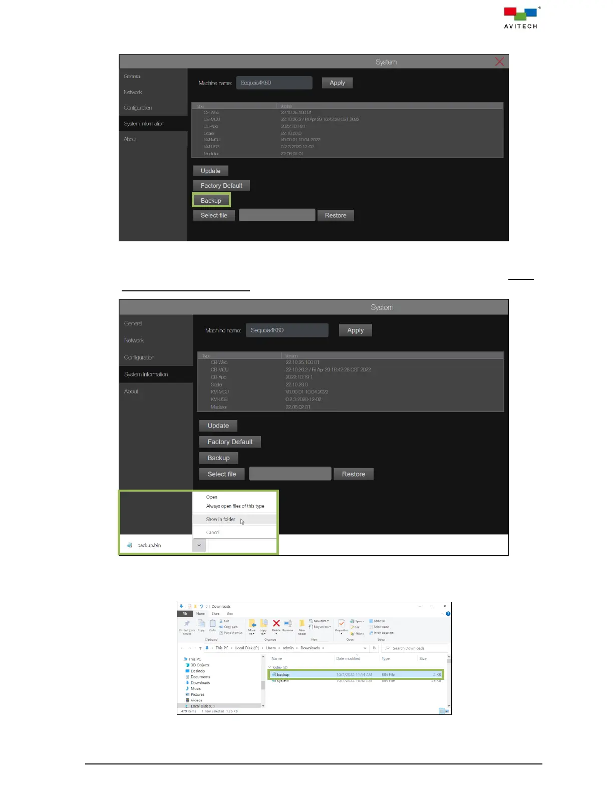 Figure 4.3.4.17 System Page: Click and Select Show in folder