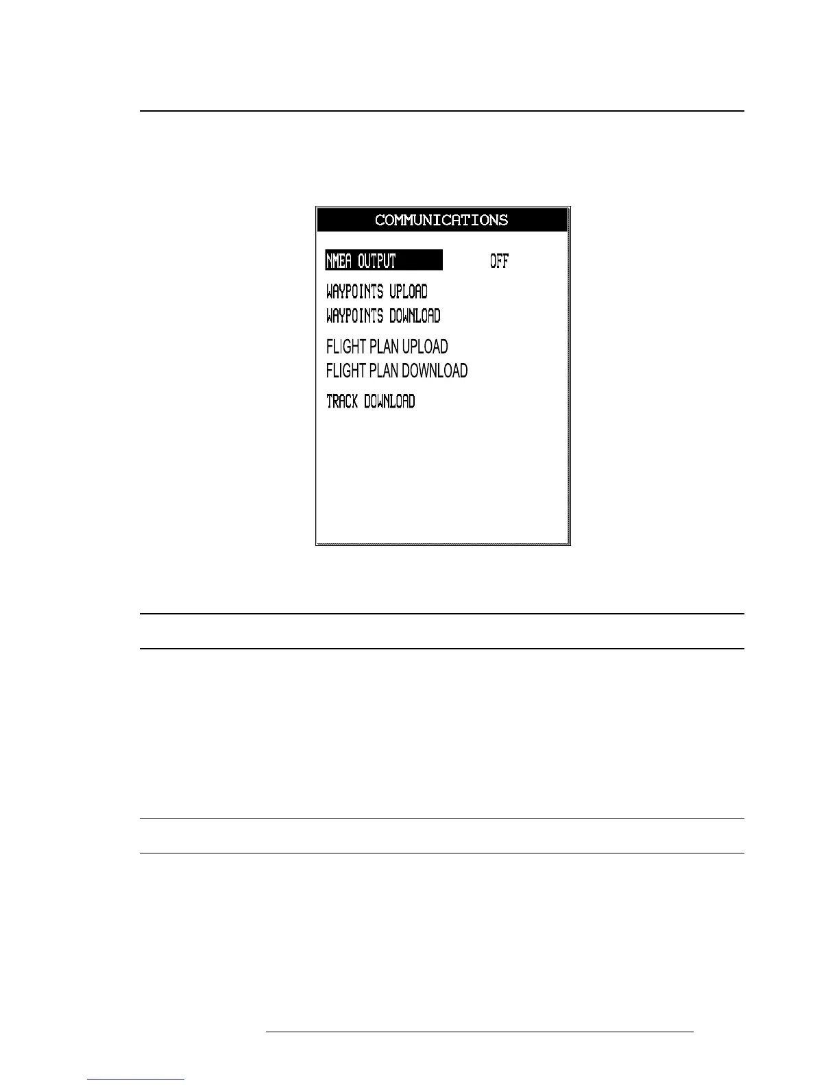 > ‘MENU’ 1 sec. + “COMMUNICATIONS” + ‘ENTER’ + “WAYPOINTS UPLOAD” + ‘ENTER’