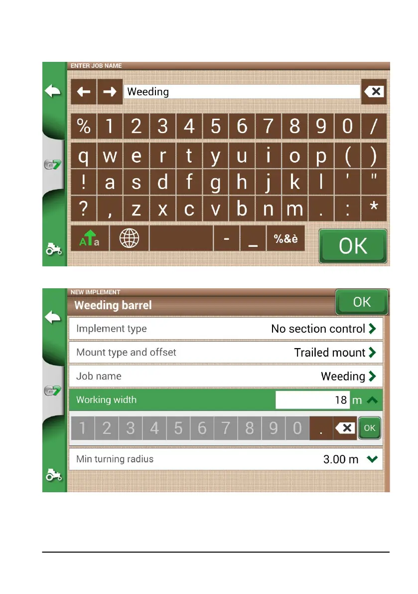9. Tap “Working width”, insert implement width, and select “OK”;