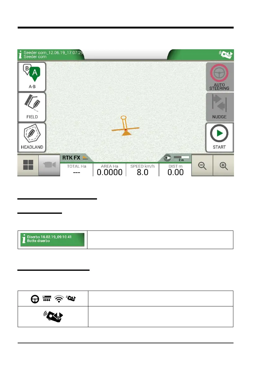 Job and implement names appear at the upper left corner of the page. Touch “i” to directly access