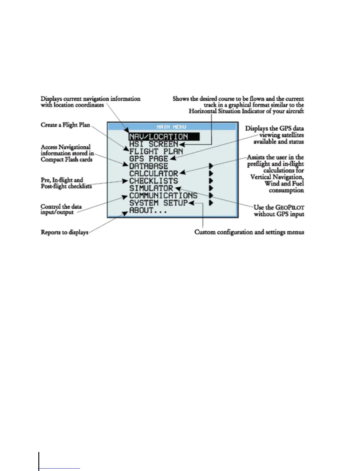 From Moving Map press ‘MENU’ for 1 second to display the Main Menu: