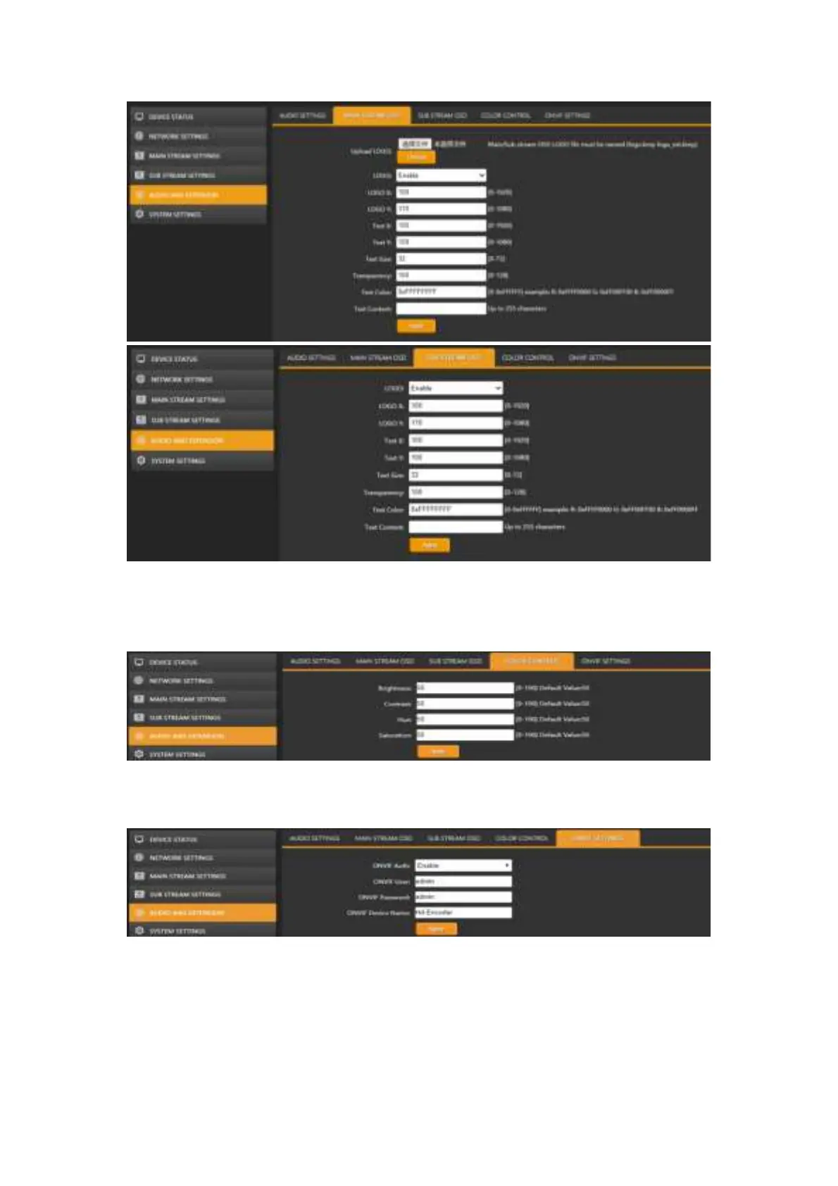 AVMATRIX SE1117 - Color Control; ONVIF Settings; System Settings