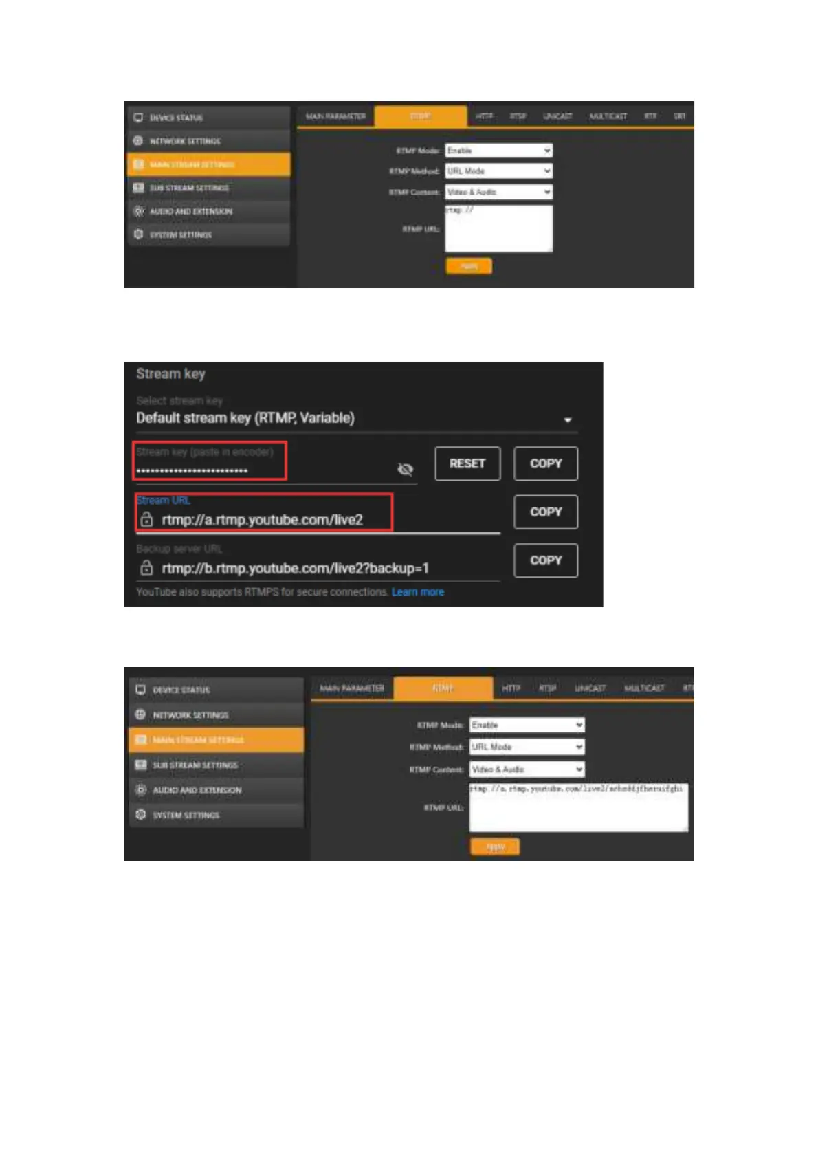 For example, the stream URL is “rtmp://a.rtmp.youtube.com/live2”.