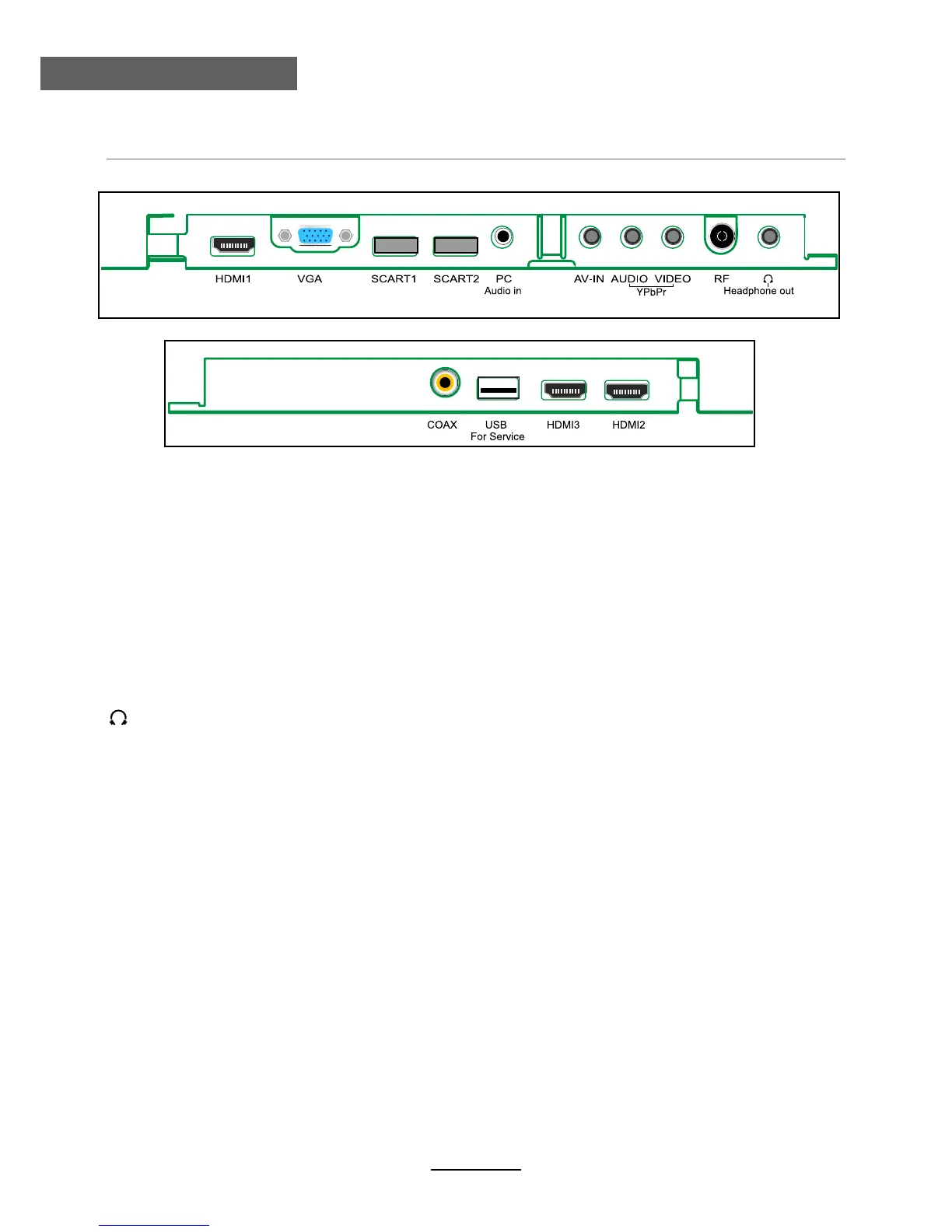 RF: Connect antenna or cable 75 Ohm coaxial to receive TV signal.