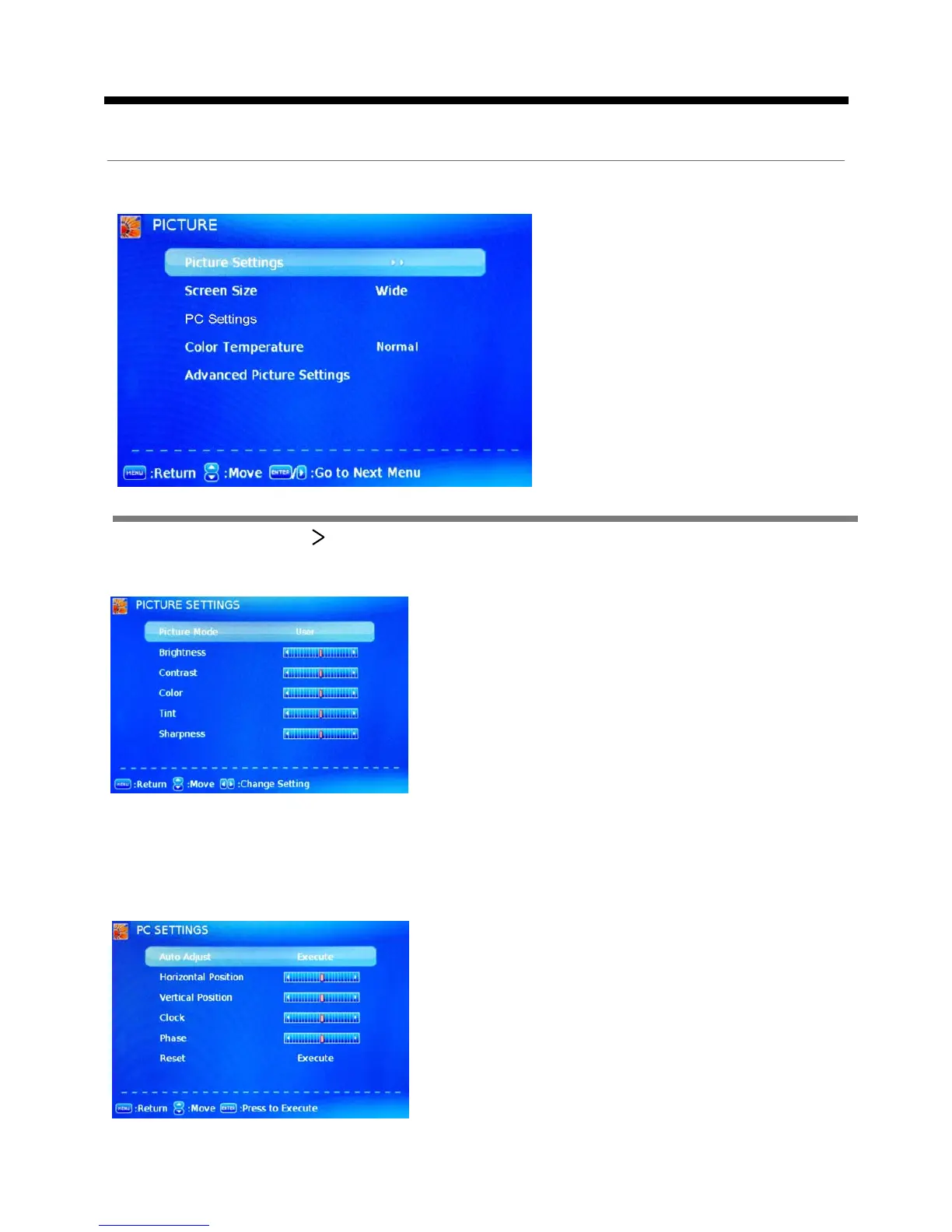 Picture Settings: Press button to enter the Picture Settings menu.