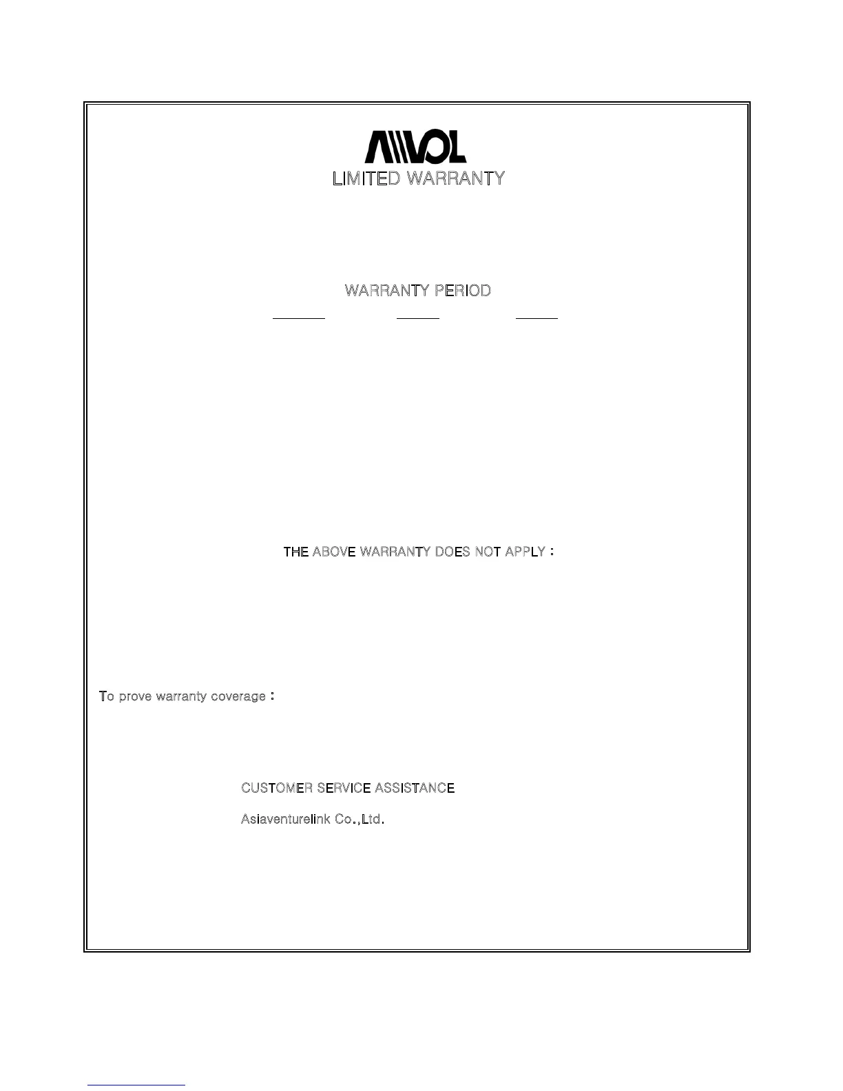 Asiaventurelink Co.,Ltd. will repair or replace without charge,at its option, your product which proves to
