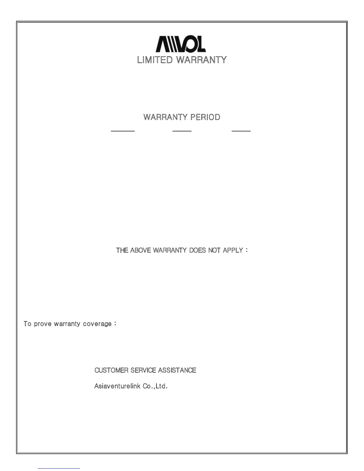 Asiaventurelink Co.,Ltd. will repair or replace without charge,at its option, your product which proves to be
