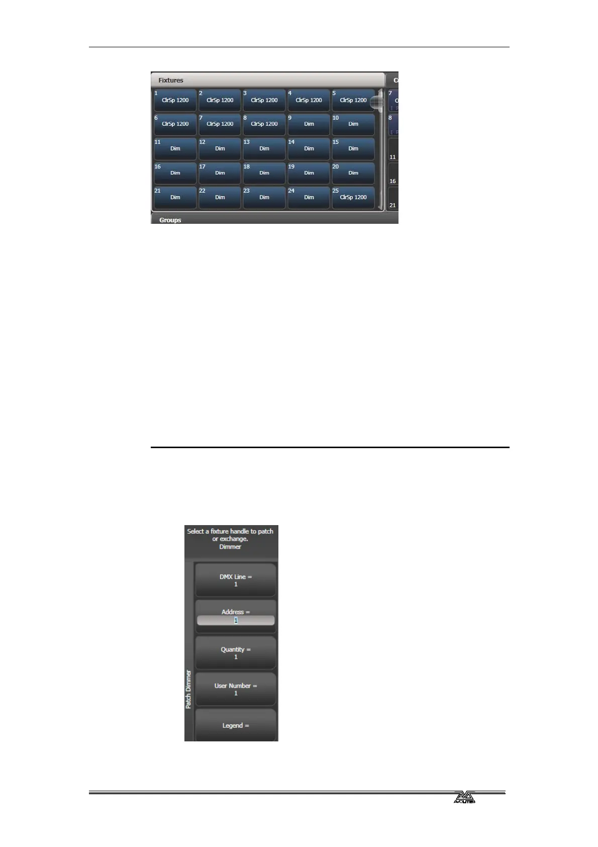 quickly select a set of fixtures with one button. Groups are described