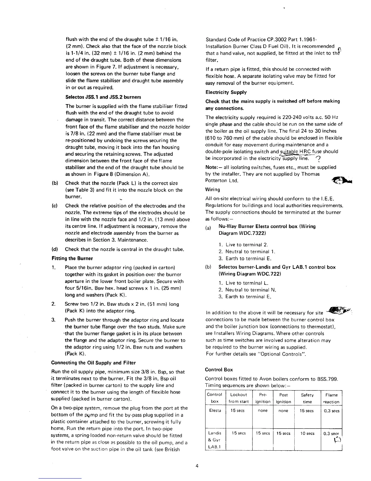 Avon One - Burner Fitting and Connections; Wiring and Control Box Information