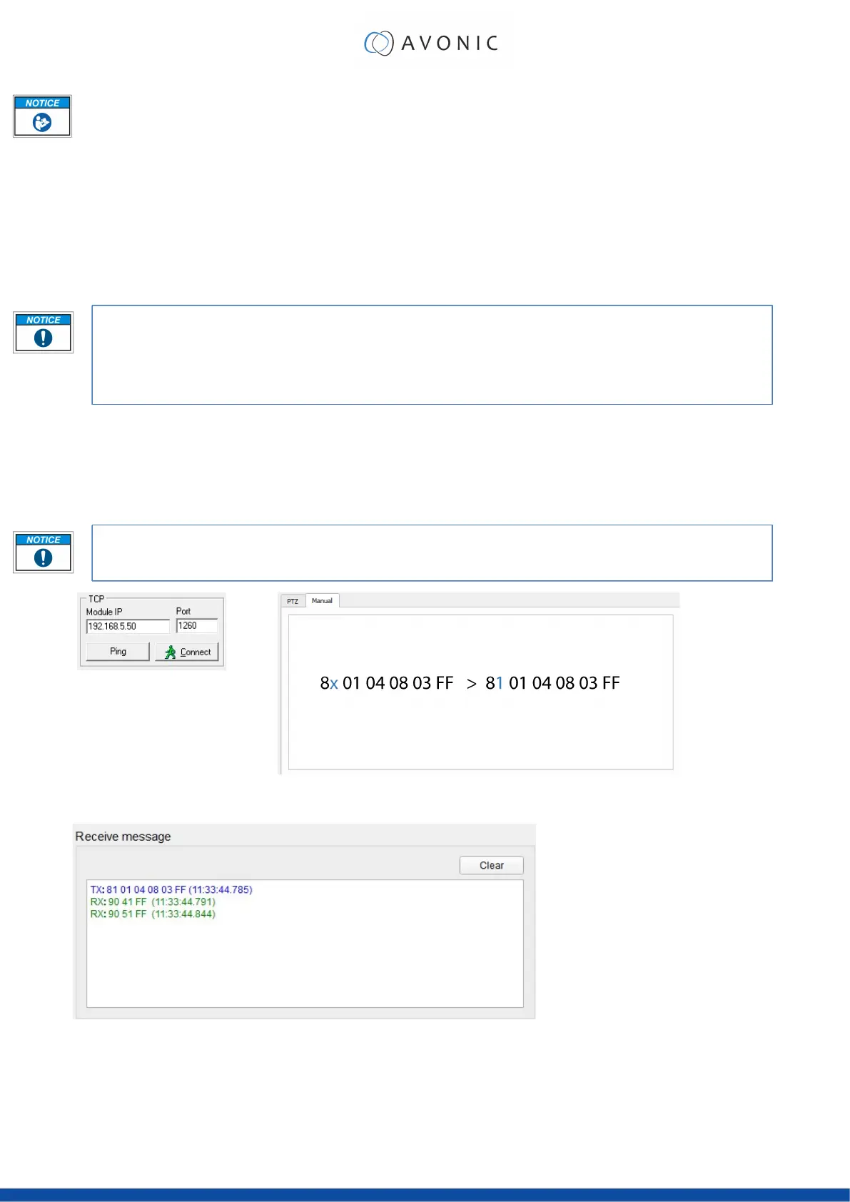 The pictures below are showing an example of a VISCA command (Focus near) with their return commands.