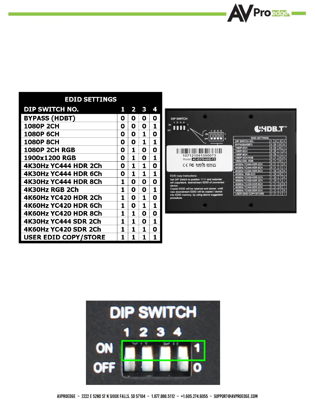 Default out of the box all the dip switches are down (o) “BYPASS (HDBT)”mode. This will pass the