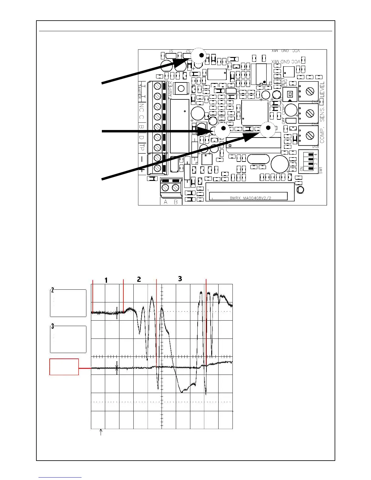 In the drawing below, the points where to connect the oscilloscope are shown: