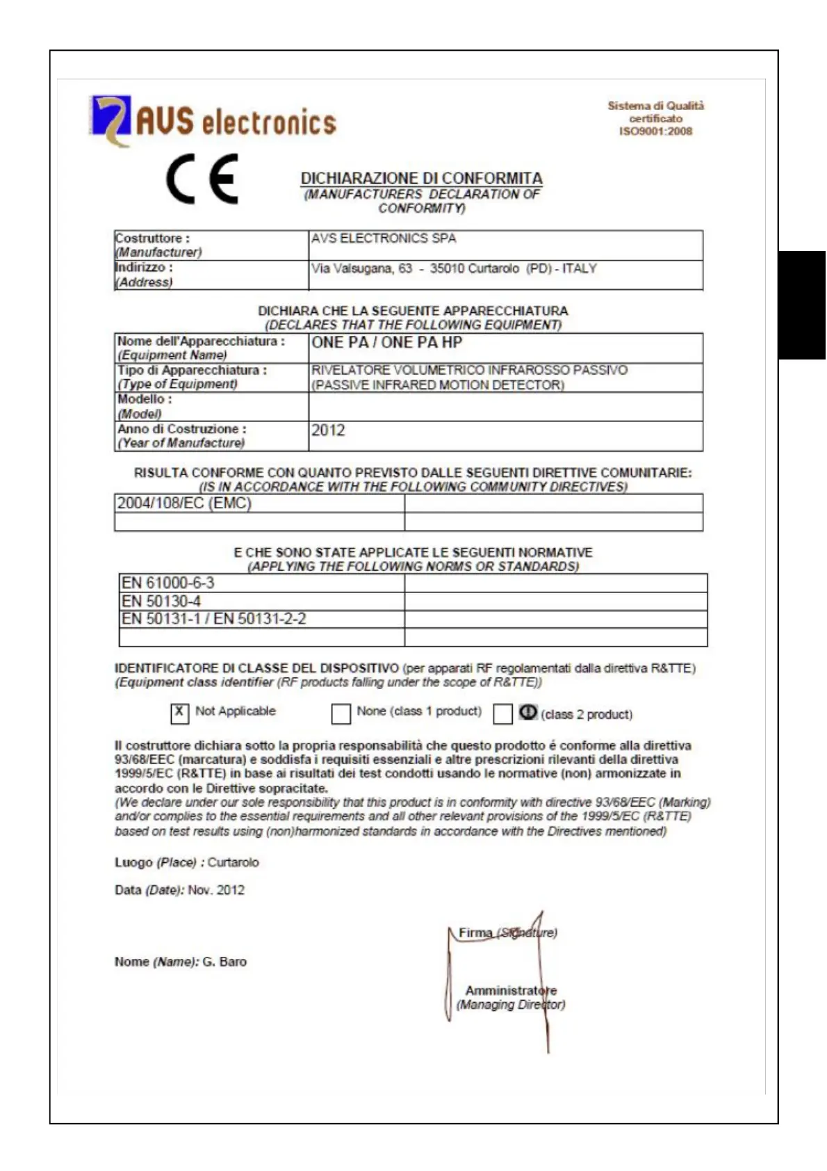 AVS Electronics ONE PA - Declaration of Conformity - ONE PA;ONE PA HP