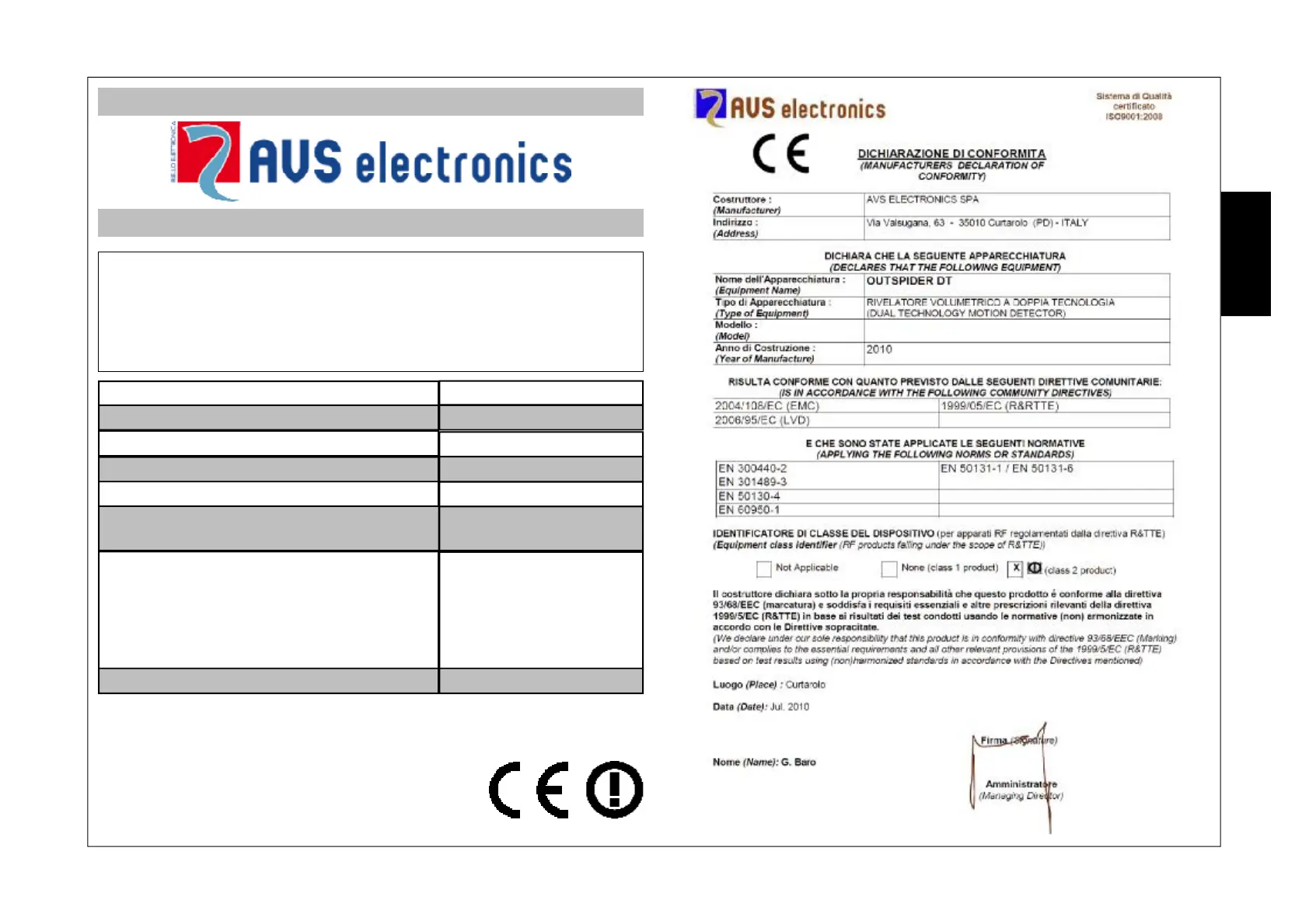 INFORMAZIONI IN CONFORMITA’ CON LA DIRETTIVA 1999/5/CEE (R&TTE)
