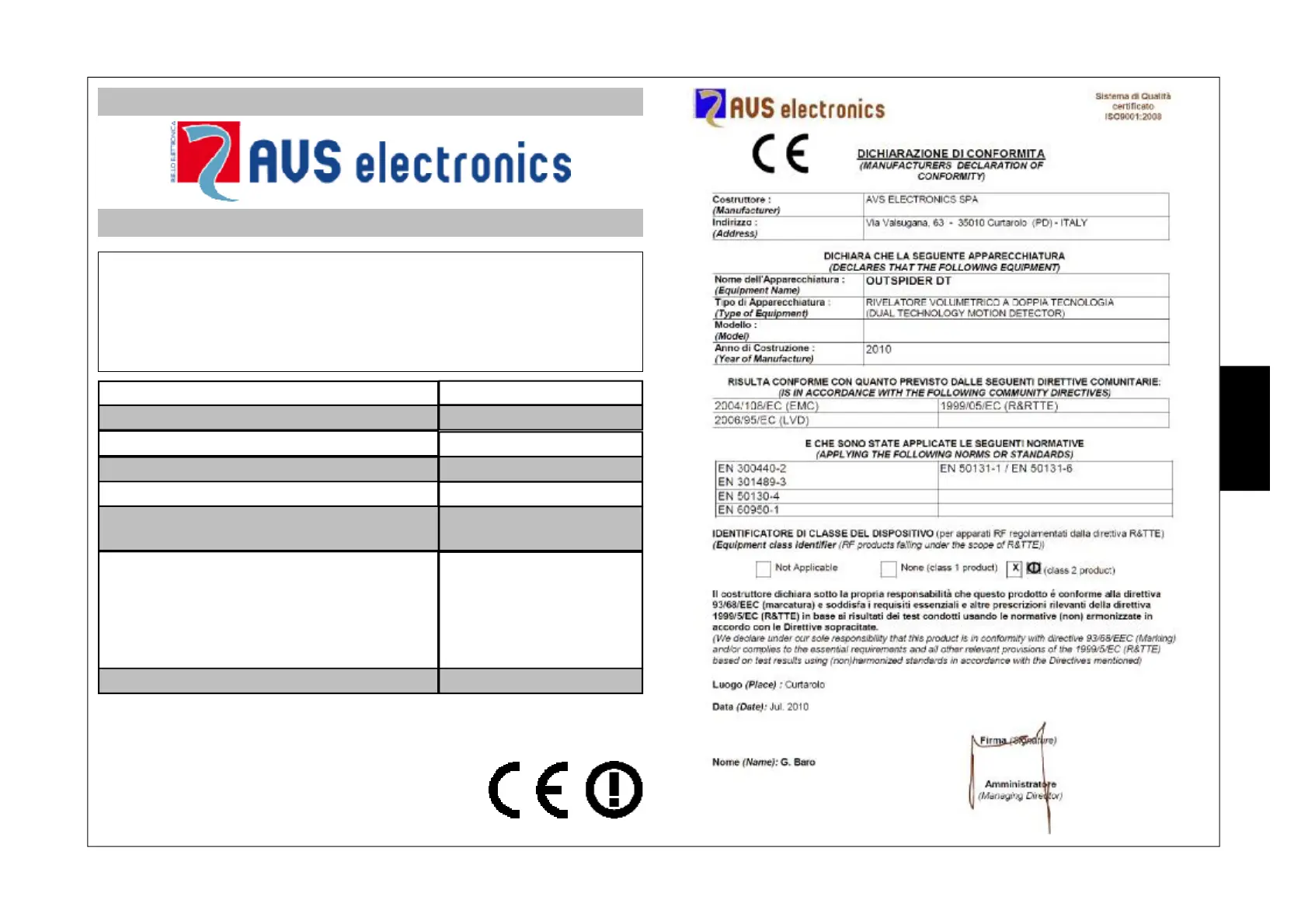 This product subject of this declaration conforms to the fundamental requirements of Directive 1999/
