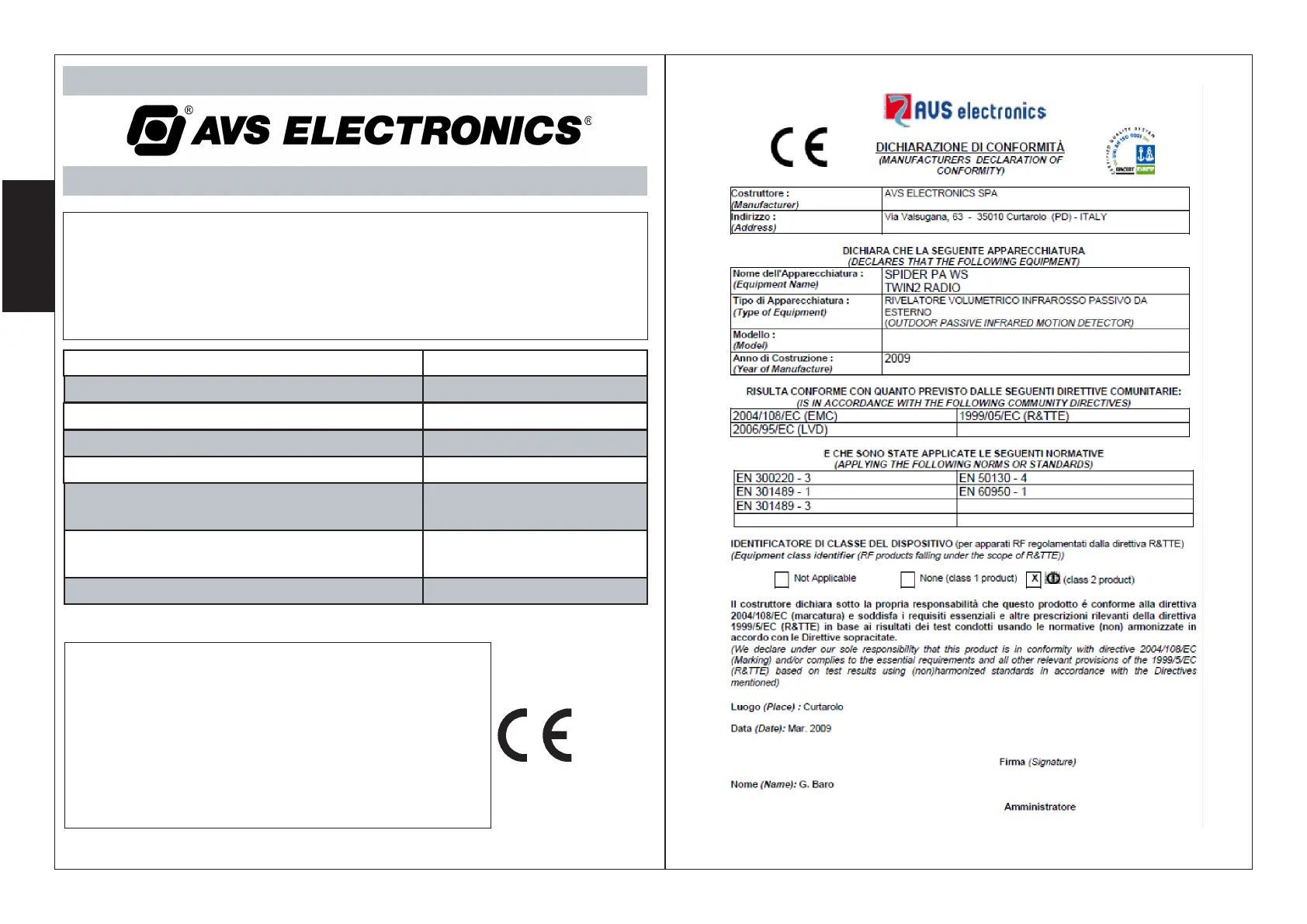 INFORMAZIONI IN CONFORMITA’ CON LA DIRETTIVA 1999/5/CEE (R&TTE)