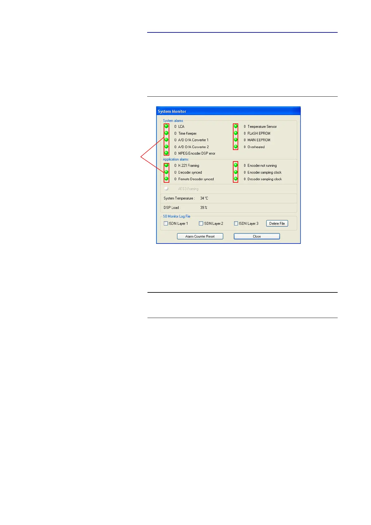 •Under System alarms all possible system alarms are displayed. A red