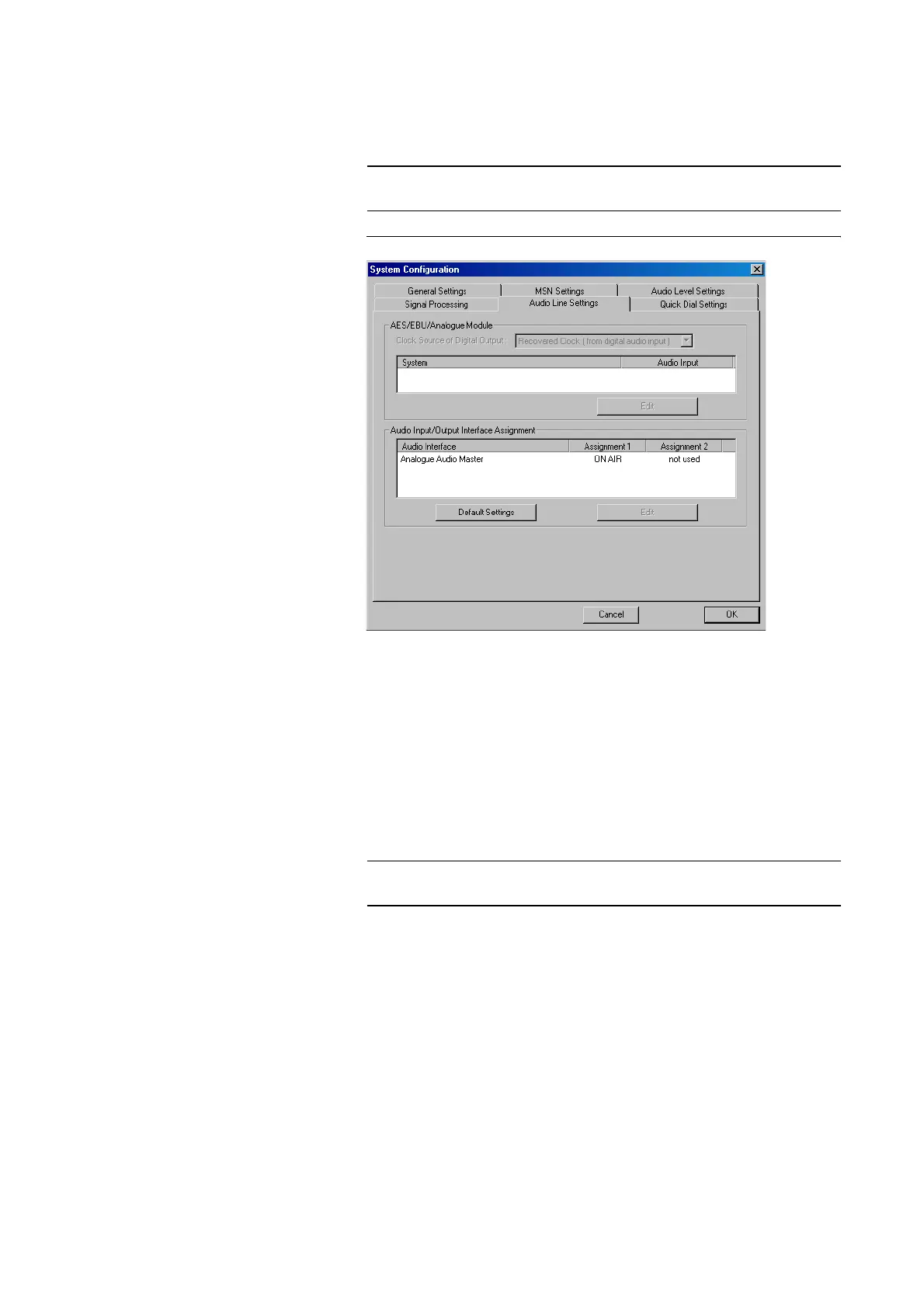 Under Audio Line Settings, the audio interfaces of the system can be config-