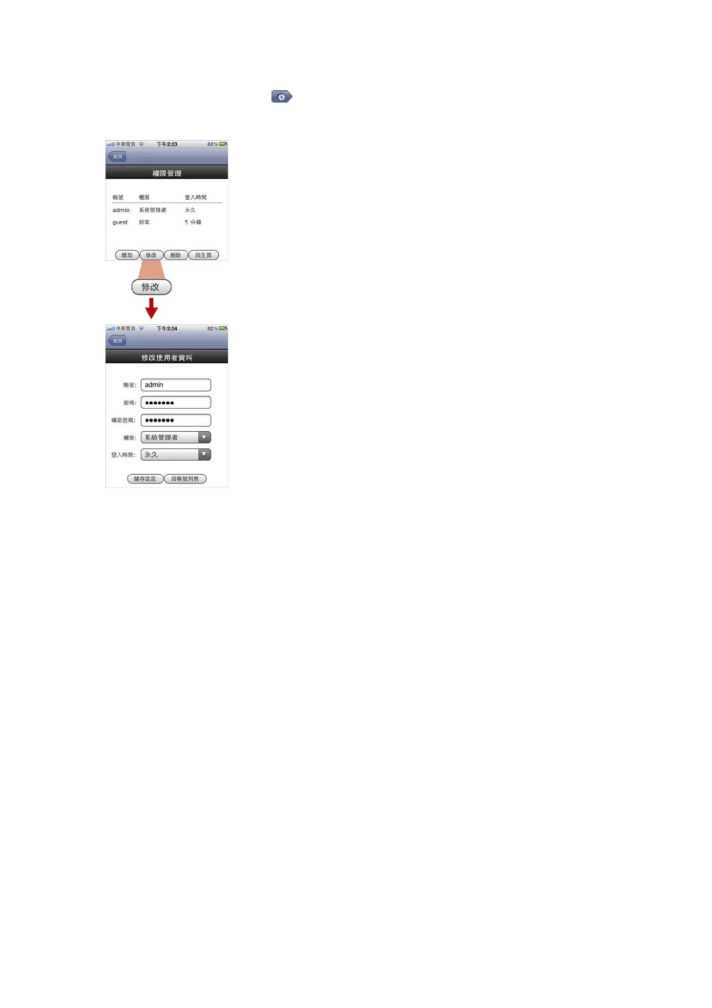 點選 [進階設定] [帳號設定],您即可選定預設帳號 “admin”,點選 [修改] 以變更預設密碼。
