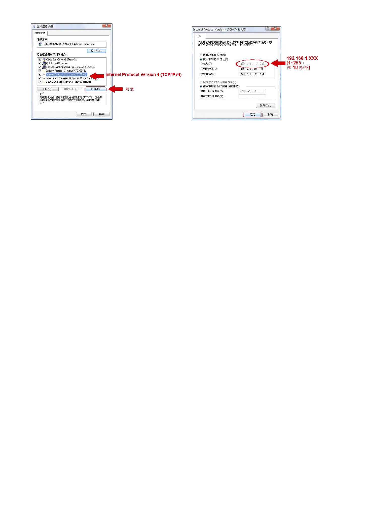 e) [確定] 關閉 [Internet Protocol Version 4 (TCP/IPv4) 內容] 對話框,然後再按 [關閉] 來關閉 [區域連