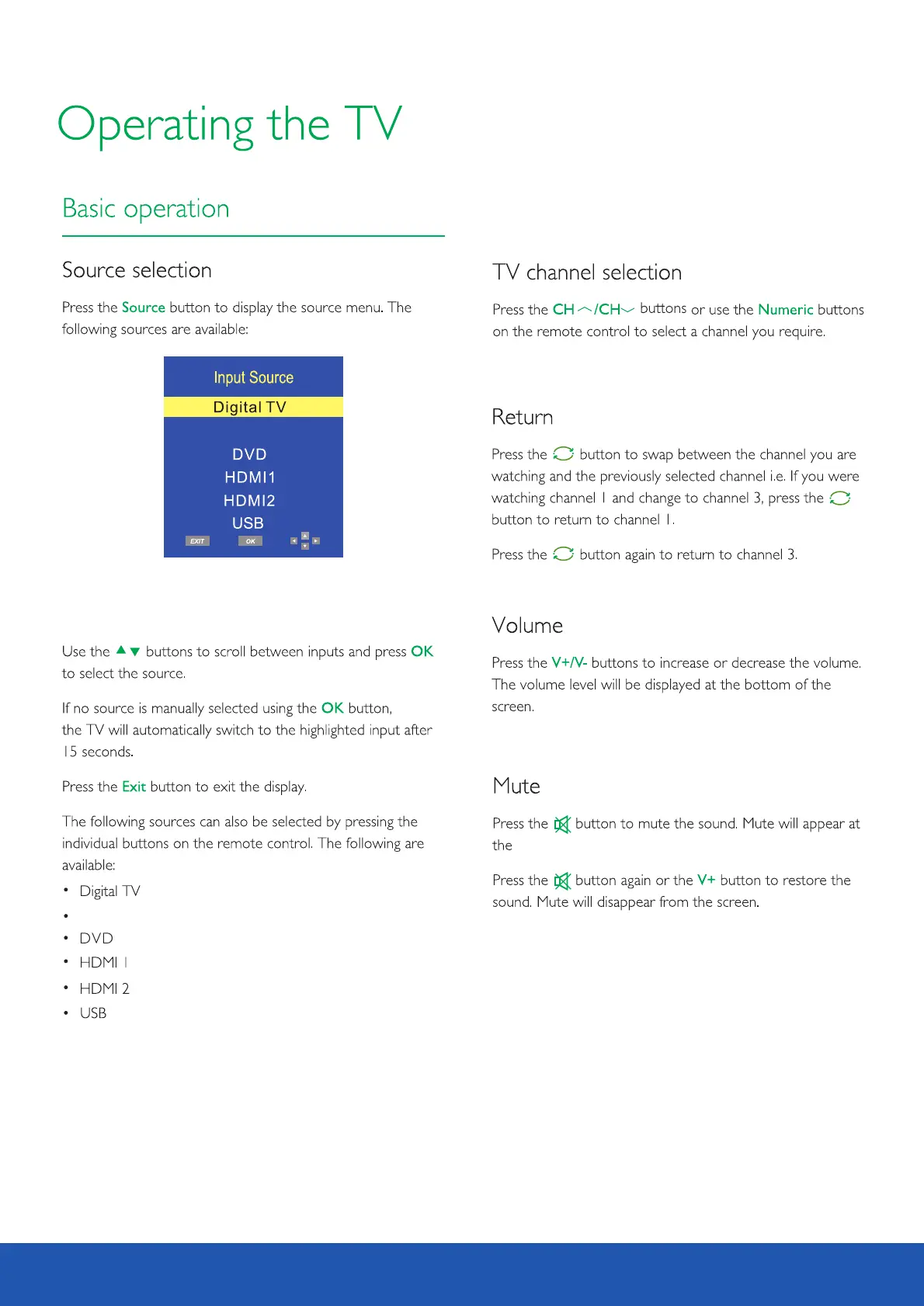 Avtex L168DRS - Basic operation; Source selection; TV channel selection; Volume and Mute