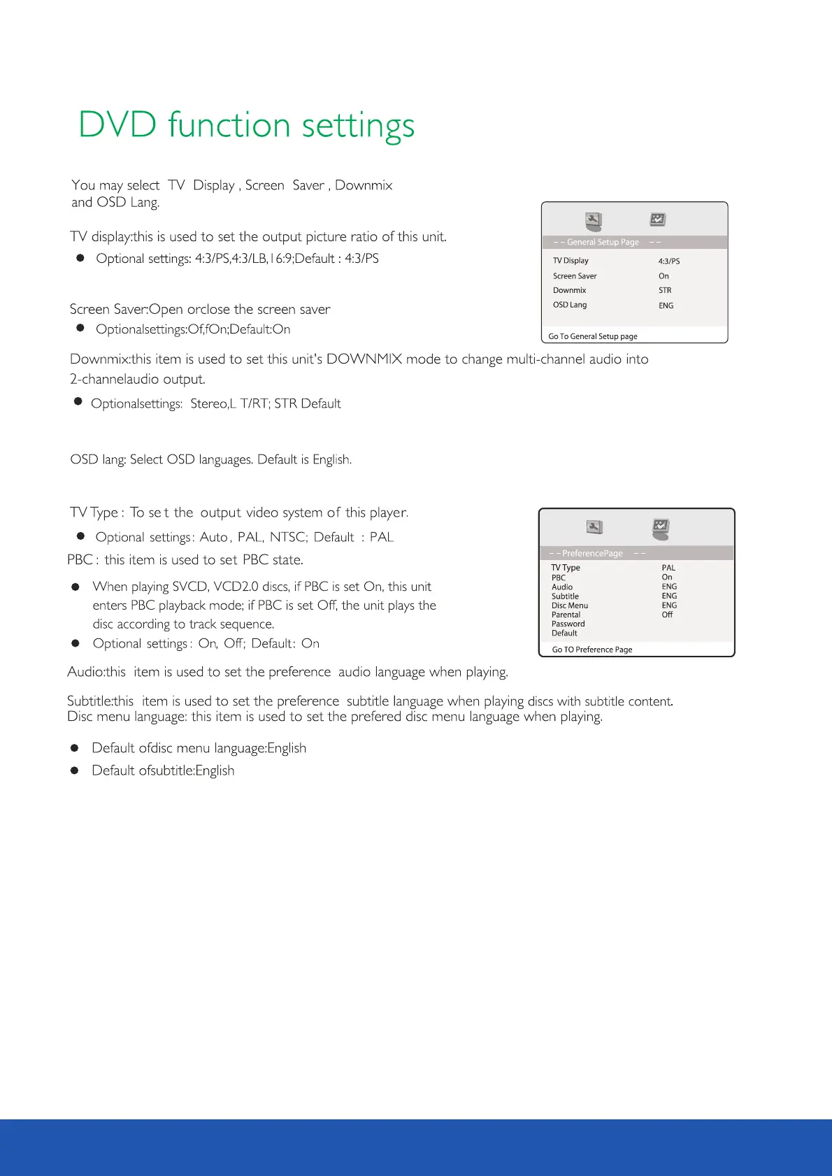 Avtex L168DRS - DVD function settings; Display and format settings; Audio, Subtitle, and Parental controls
