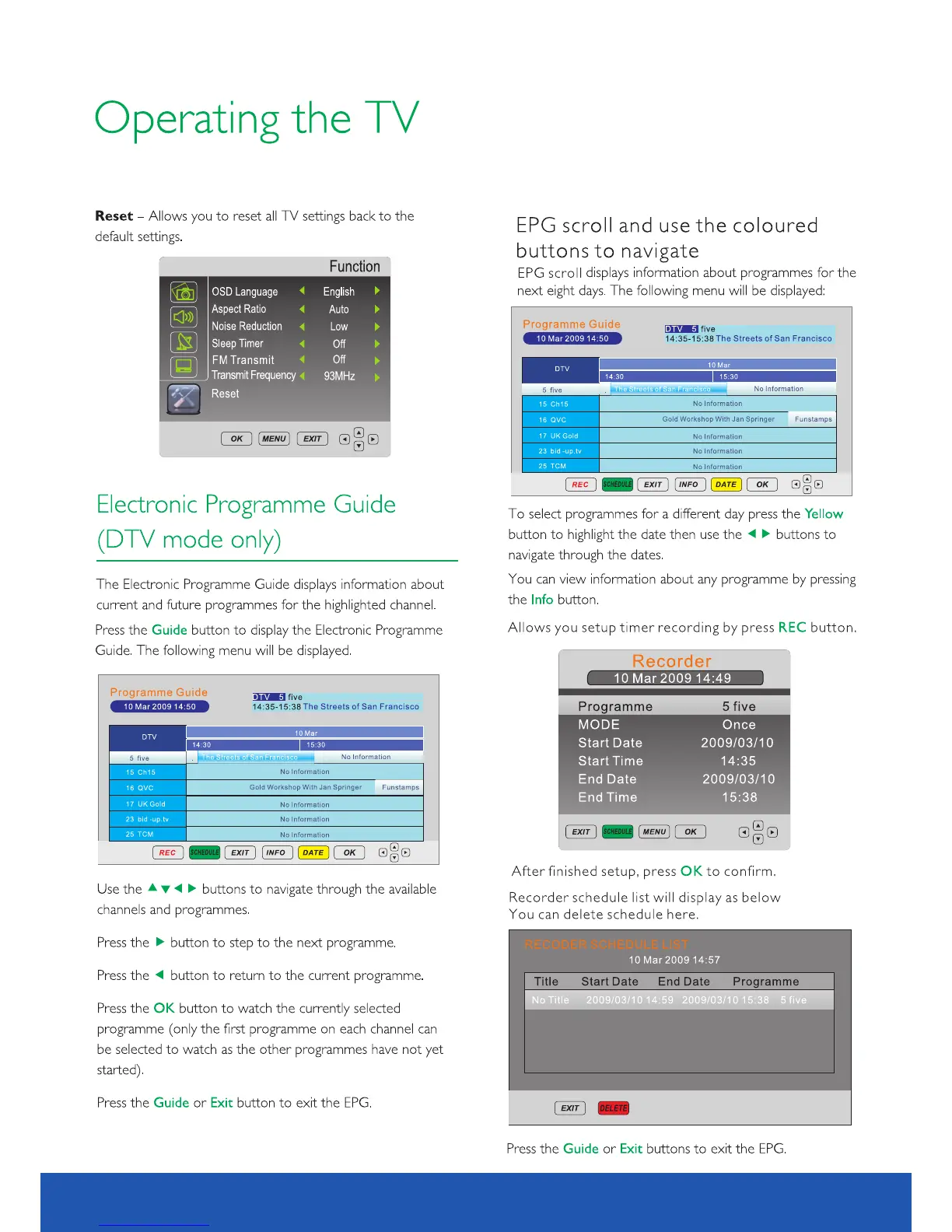Avtex L185DR - Reset; Electronic Programme Guide (DTV mode only); EPG scroll and use the coloured buttons to navigate; Recorder