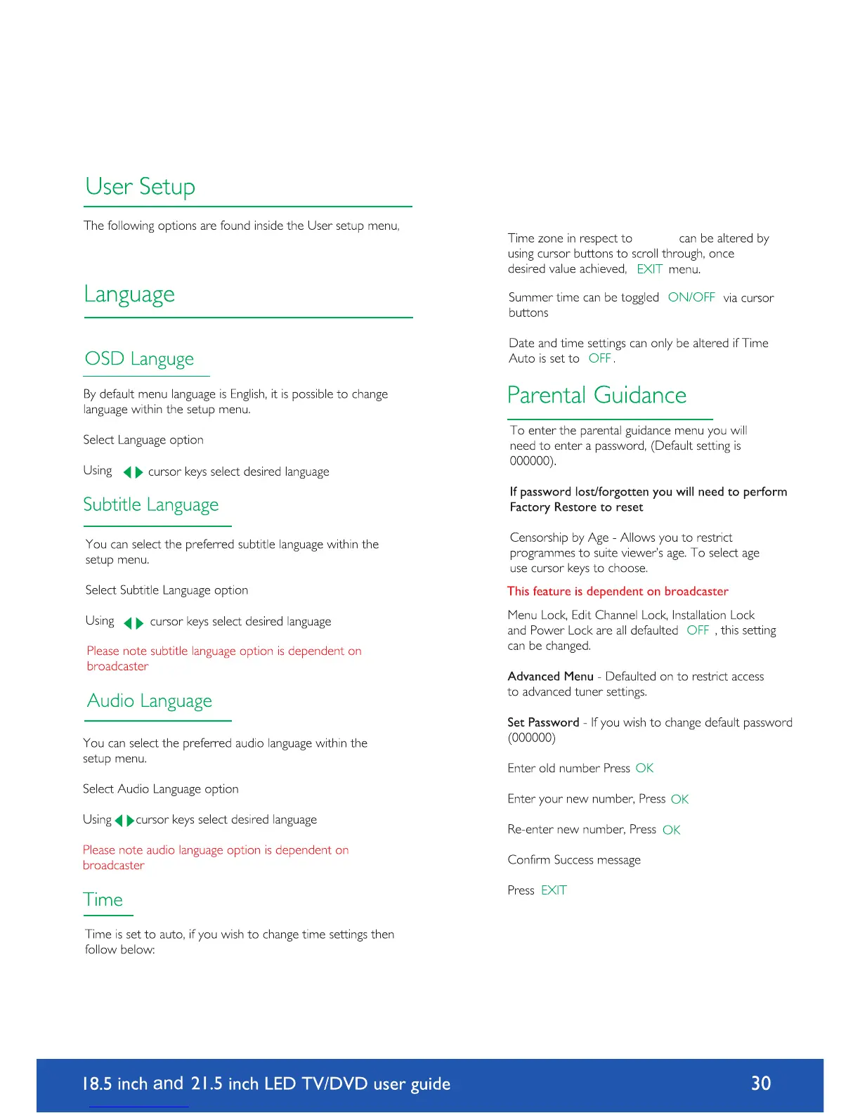 Avtex L185DRS - User Setup; Language; Parental Guidance; Set Password