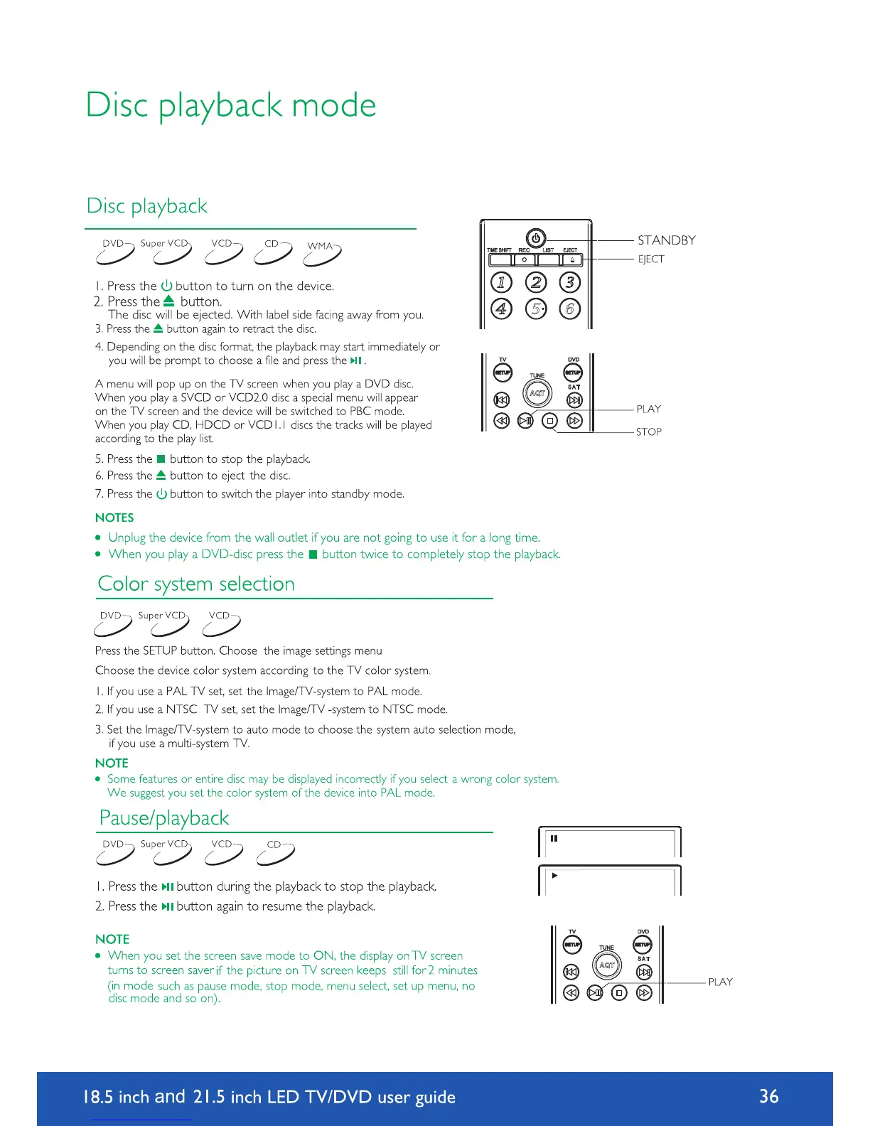Avtex L185DRS - Disc playback mode; Disc playback; Color system selection