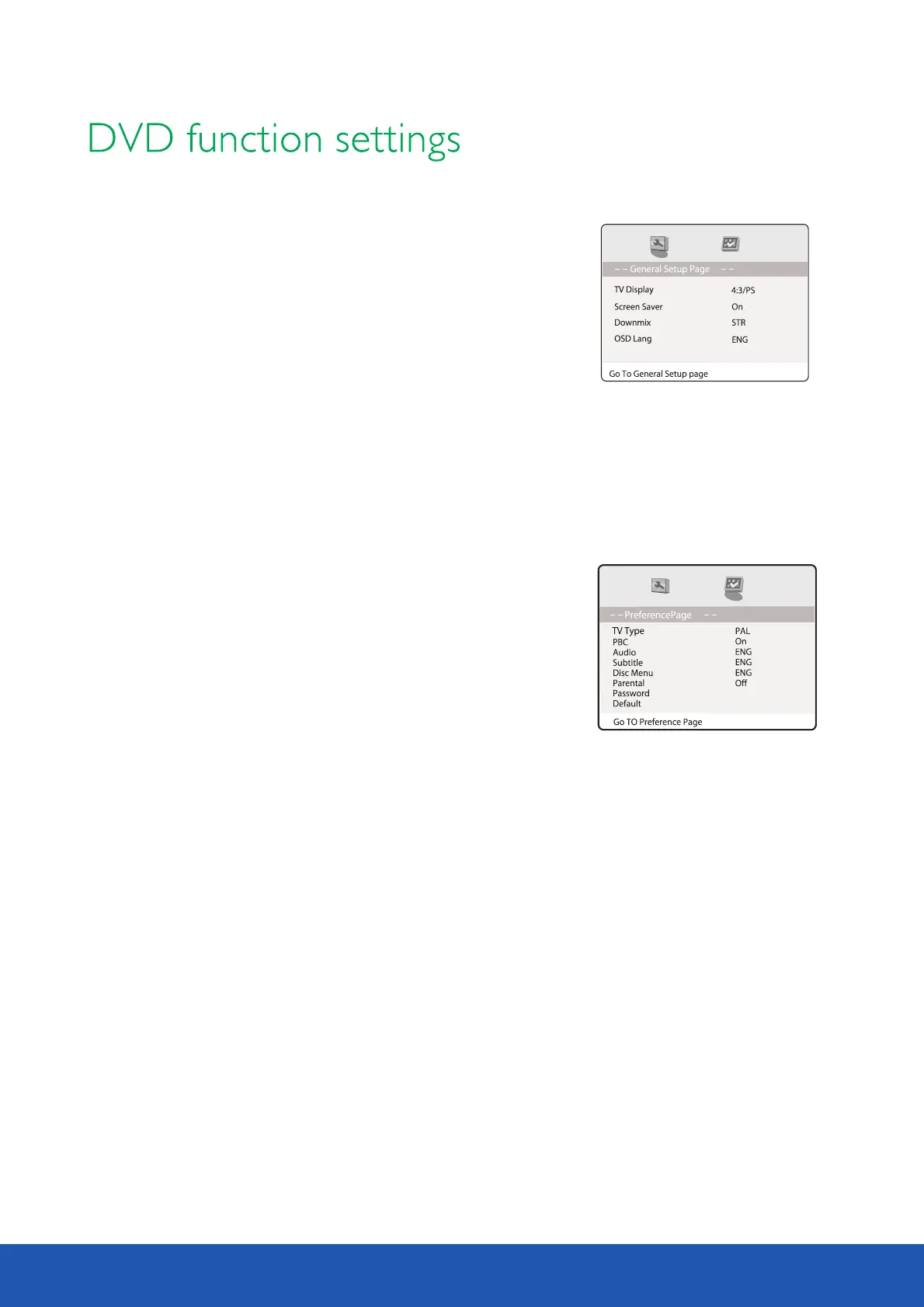 Optional settings: Auto, PAL, NTSC; Default; PAL PBC: this item is used to set PBC state.