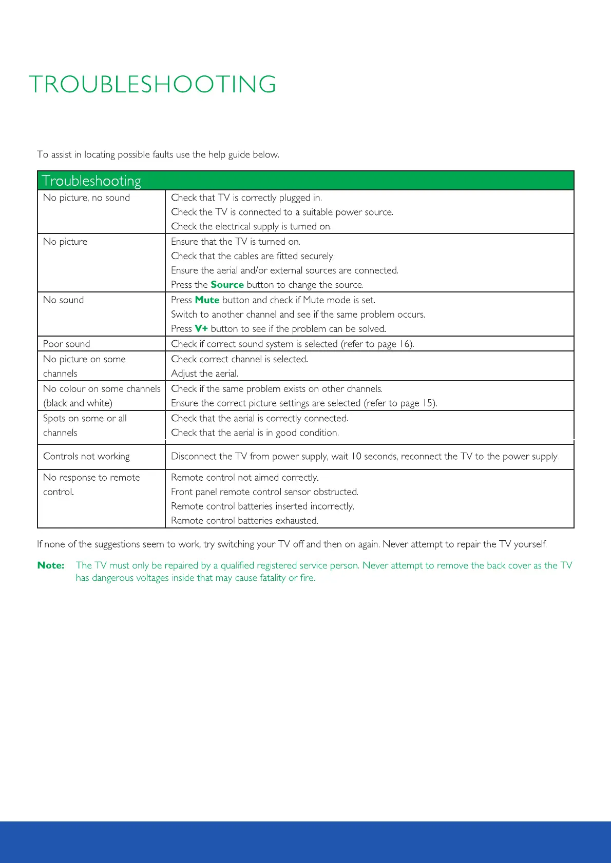 Avtex L219DRS-PRO - Troubleshooting; Picture and Sound Issues; Channel and Colour Issues; Remote Control Issues
