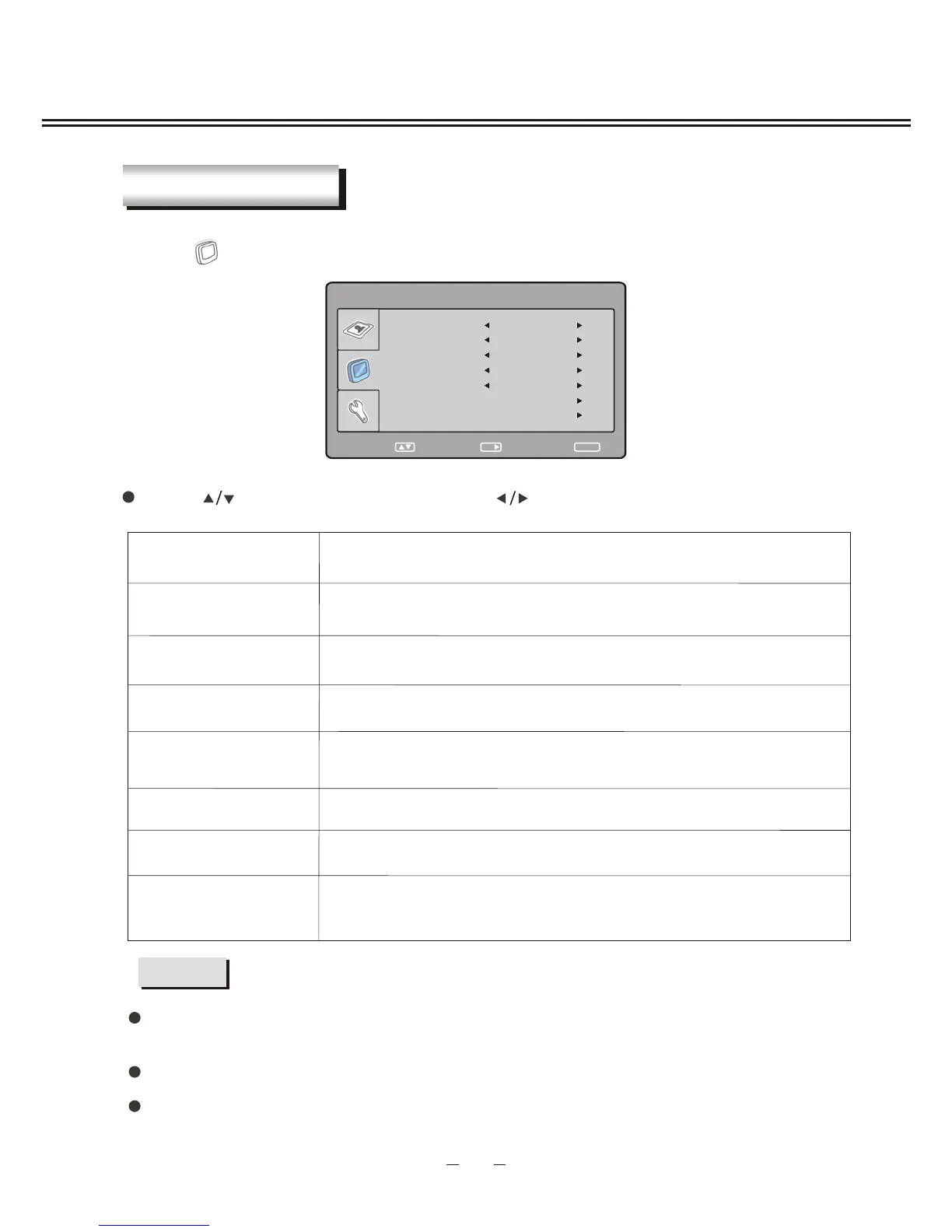 Press [ ] button to select item and press [ ] button to adjust .