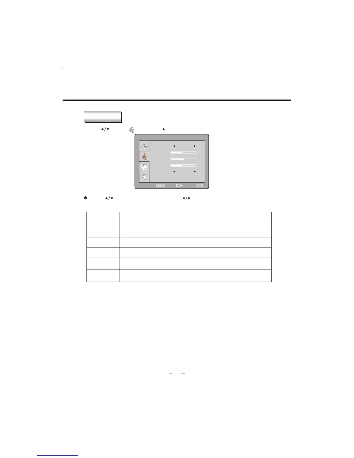 Press [ ] button to select item and press [ ] button to adjust . The following is sound