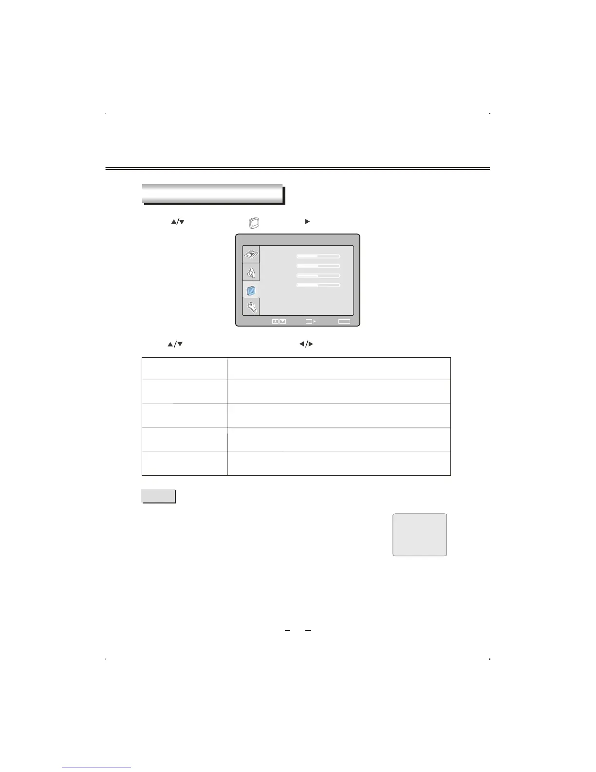 Press [ ] button to select item and press [ ] button to adjust value of item.